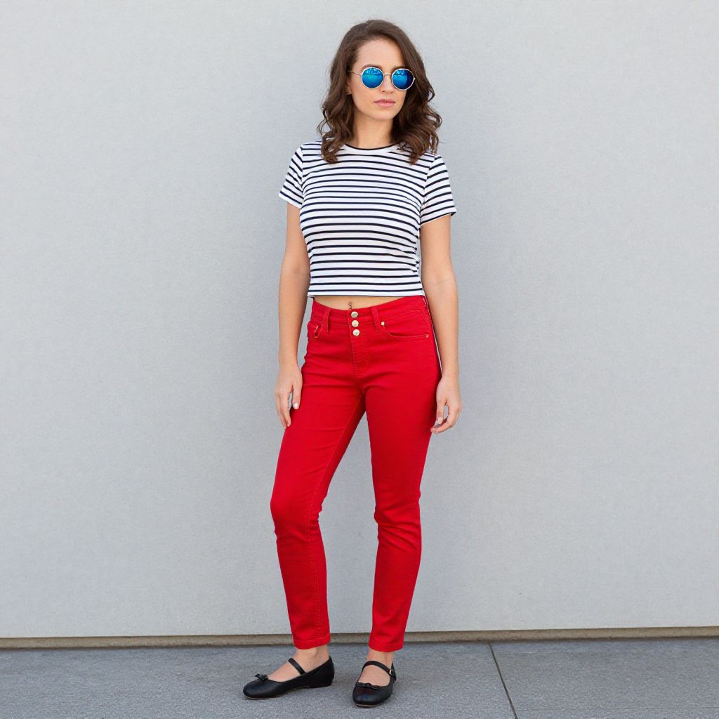 Photograph of a young woman with light skin and wavy brown hair standing against a plain white wall. She wears blue reflective sunglasses, a white and black striped short-sleeve t-shirt, and bright red high-waisted jeans with front buttons. Her feet are in black flat shoes with small bows. The background is simple and uncluttered, focusing attention on her stylish outfit. The image has a bright and colorful aesthetic, with high contrast between her red jeans and white shirt.