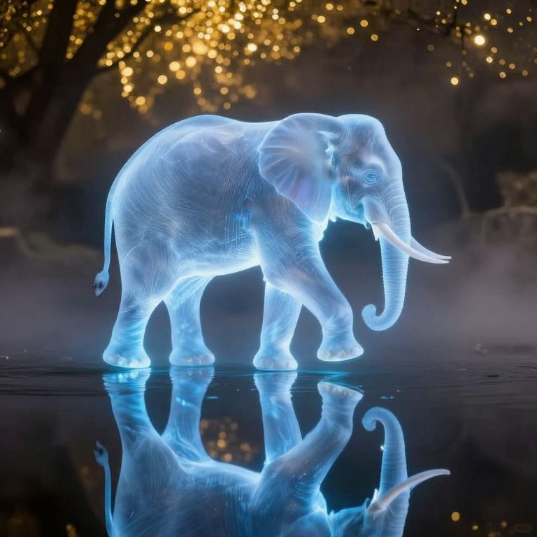 Translucent elephant composed of luminous blue light strides gracefully across a reflective surface, its silhouette mirrored perfectly beneath while a misty backdrop shimmers with scattered golden lights.
