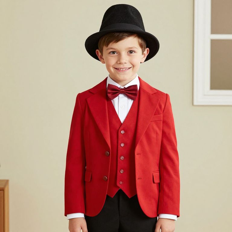 Photograph of a young boy standing indoors, wearing a formal outfit. He has light skin, brown hair, and a friendly smile. He is dressed in a bright red, three-piece suit with a white dress shirt and a black bow tie, and a black top hat. The suit has a fitted jacket, a vest with buttons, and black trousers. The background is a plain, light-colored wall with a partially visible window on the right. The boy's outfit is elegant and reminiscent of Victorian or formal attire, and he appears to be around 5-7 years old.