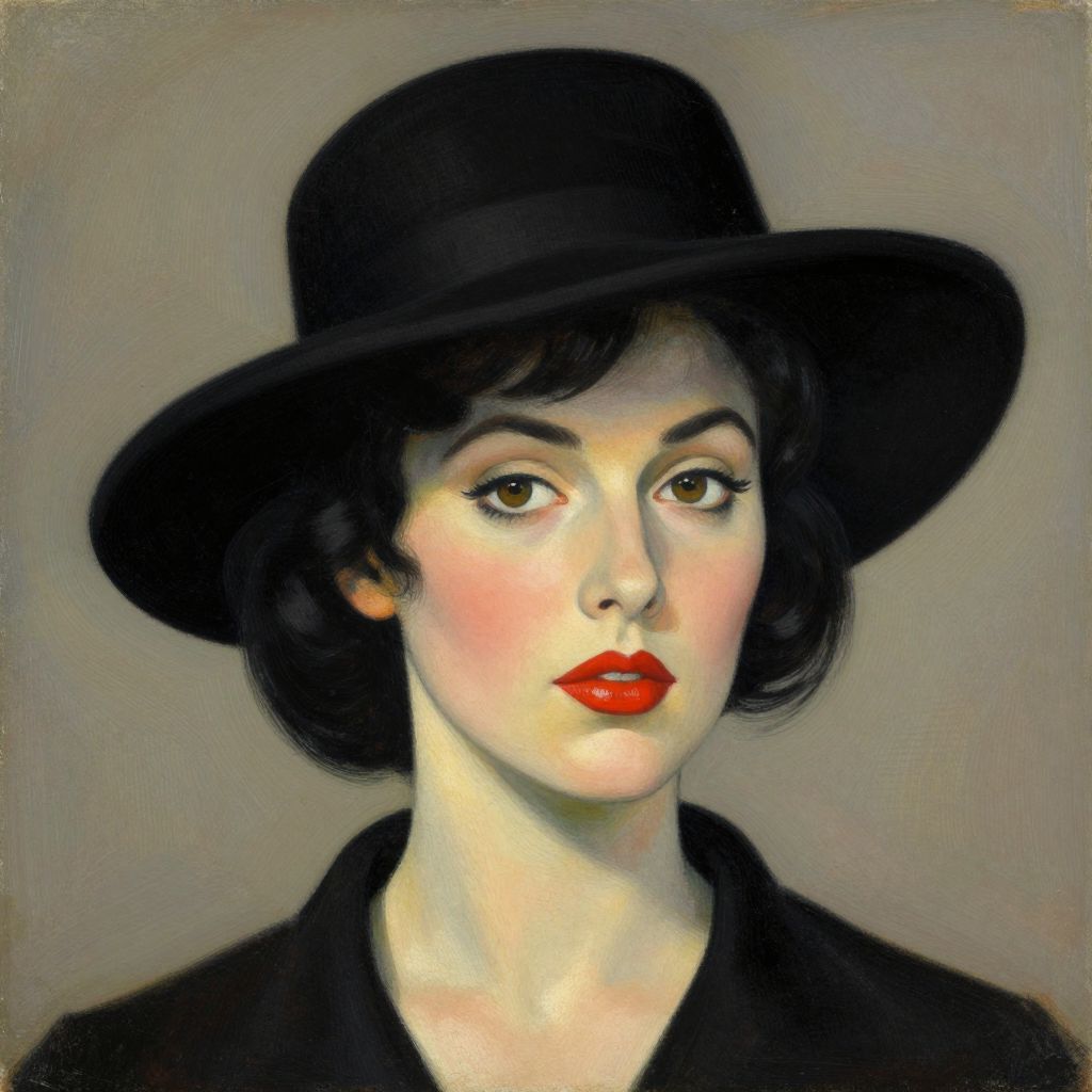 This digital painting portrays a young woman with fair skin and short, wavy black hair. She wears a black wide-brimmed hat and a black top. Her striking red lipstick contrasts with her pale complexion, and her dark, arched eyebrows frame her large, brown eyes. The background is a muted, grayish-brown, keeping the focus on her. The painting style is realistic with a slight vintage, old Hollywood glamour influence, evident in her elegant attire and makeup. The texture of the painting is smooth with subtle brushstrokes.