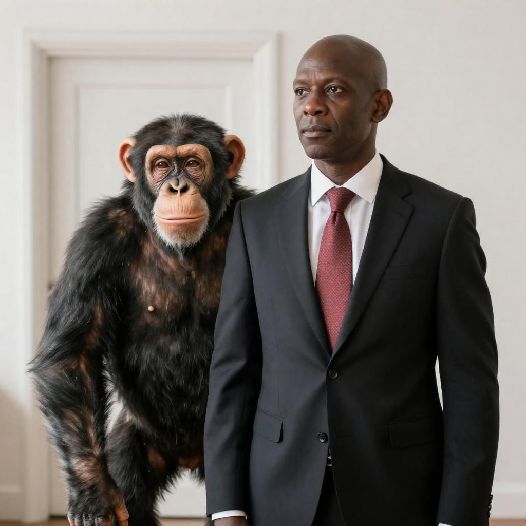 Photograph of a bald Black man in a dark suit with a red patterned tie standing beside a realistic chimpanzee. Man looks to the side with a neutral expression. Chimpanzee has a neutral expression, standing slightly behind the man. Bright, white background with a door in the background.