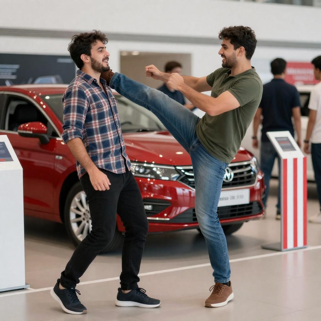 Photograph of two men in a car showroom. One man in a plaid shirt and black pants is being kicked in the face by a man in a green shirt and blue jeans. Red car in background, people walking by, store displays on both sides. Kicking man's face shows intense expression. Red and white striped flags on display.