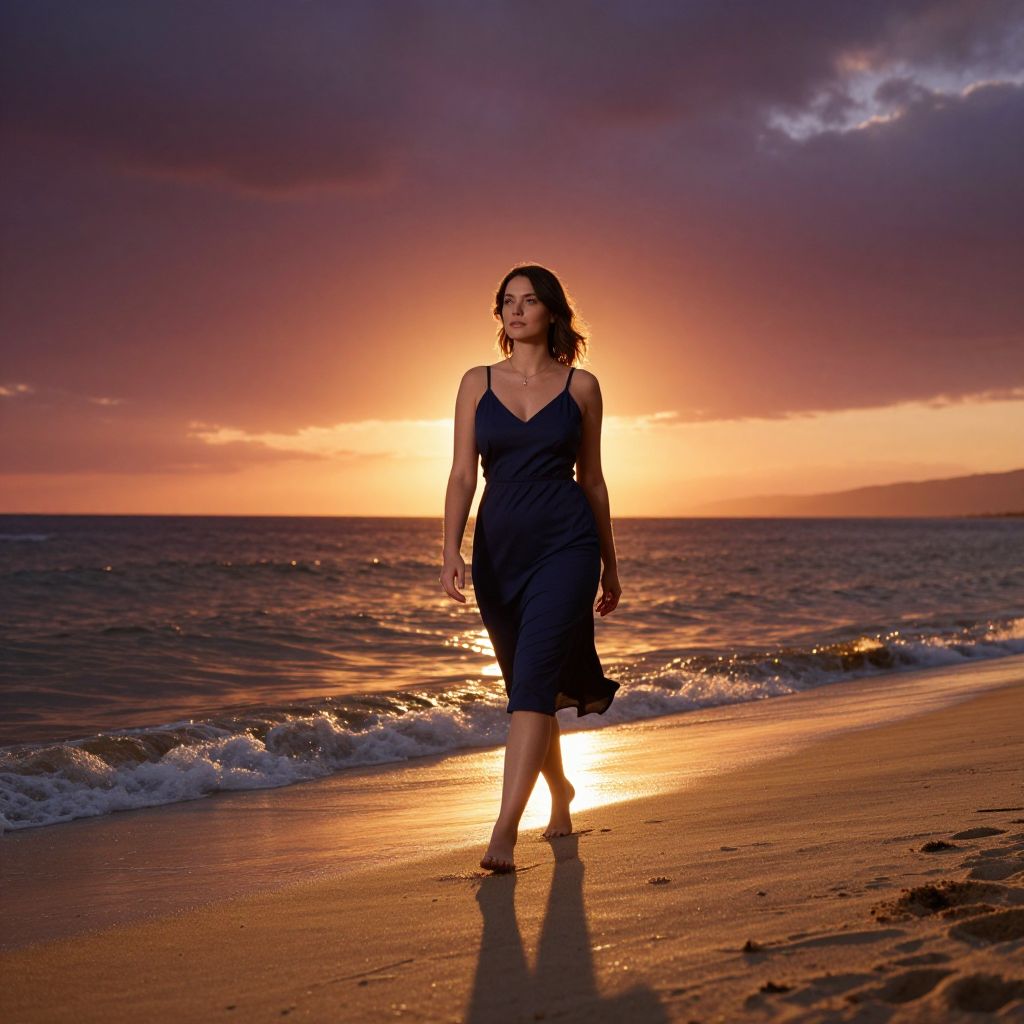Photograph of a young woman with dark hair, wearing a flowing white dress, standing barefoot on a sandy beach at sunset.