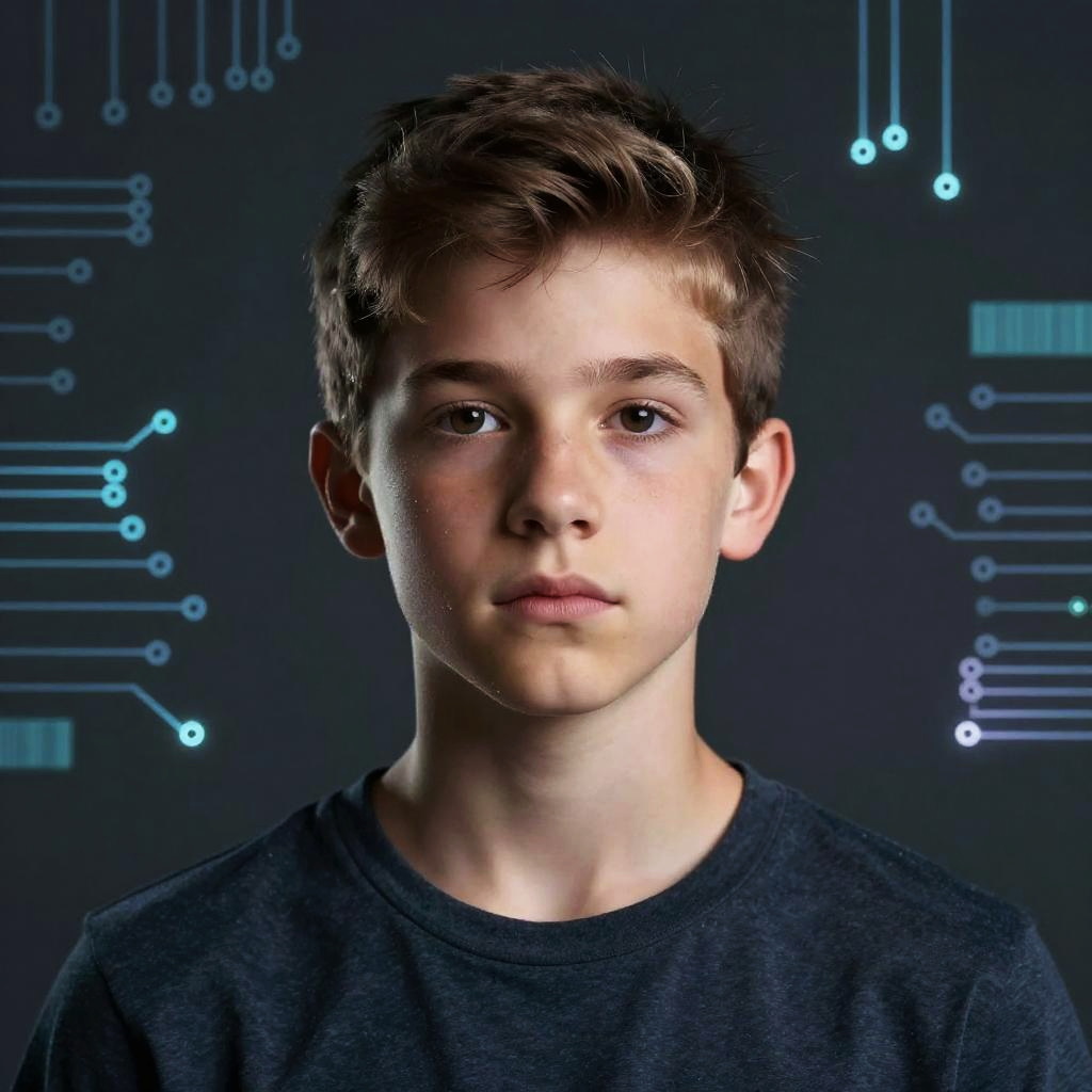 Photograph of a young Caucasian boy with short, light brown, slightly tousled hair and blue eyes. He has a fair complexion with visible freckles on his cheeks and nose. His expression is neutral, with slightly parted lips. He wears a dark gray, heathered t-shirt. The background is dark with a futuristic, circuit board-like pattern featuring blue and white lines and dots, creating a high-tech, digital ambiance. The lighting highlights his face, casting subtle shadows. The image has a clean, sharp, and modern photographic style.