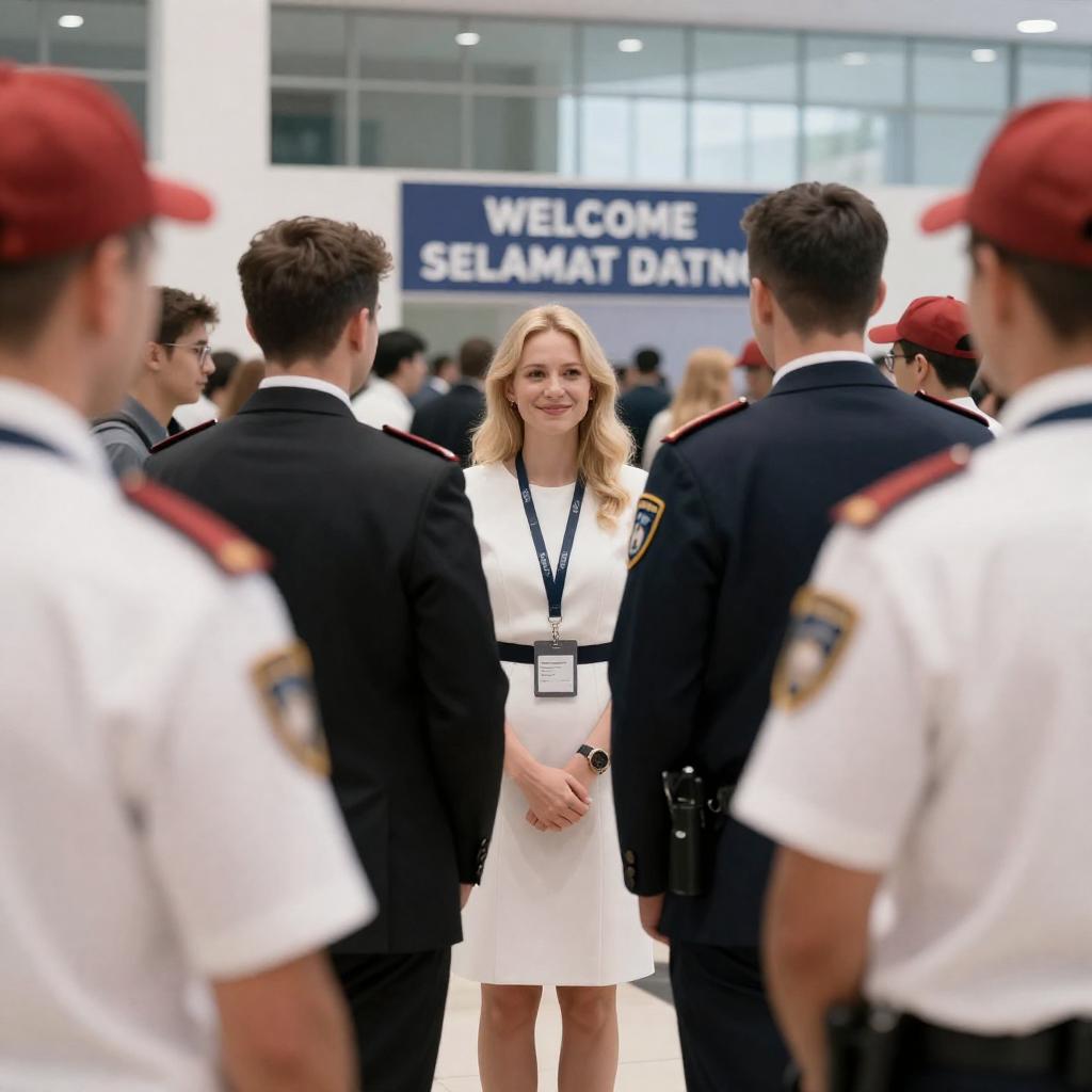 Photograph of a busy indoor event. A blonde woman in a white dress and lanyard stands in the center, smiling. She is surrounded by men in black suits and red-capped security personnel in white uniforms, blurred in the foreground. Background features a "WELCOME / SELAMAT DATANG" sign and glass walls.