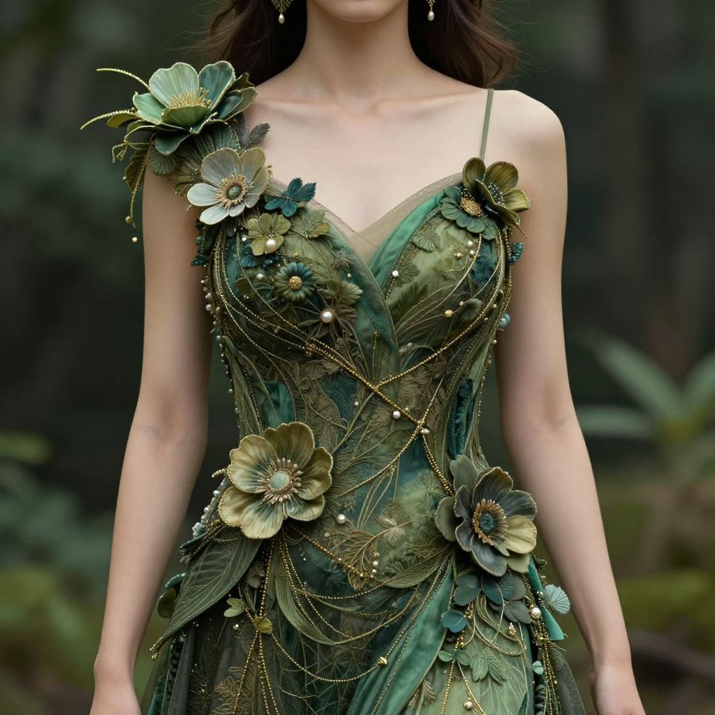 Photograph of a woman in an intricate, green, floral-themed evening gown with large, detailed flowers and gold chains, set against a blurred forest background