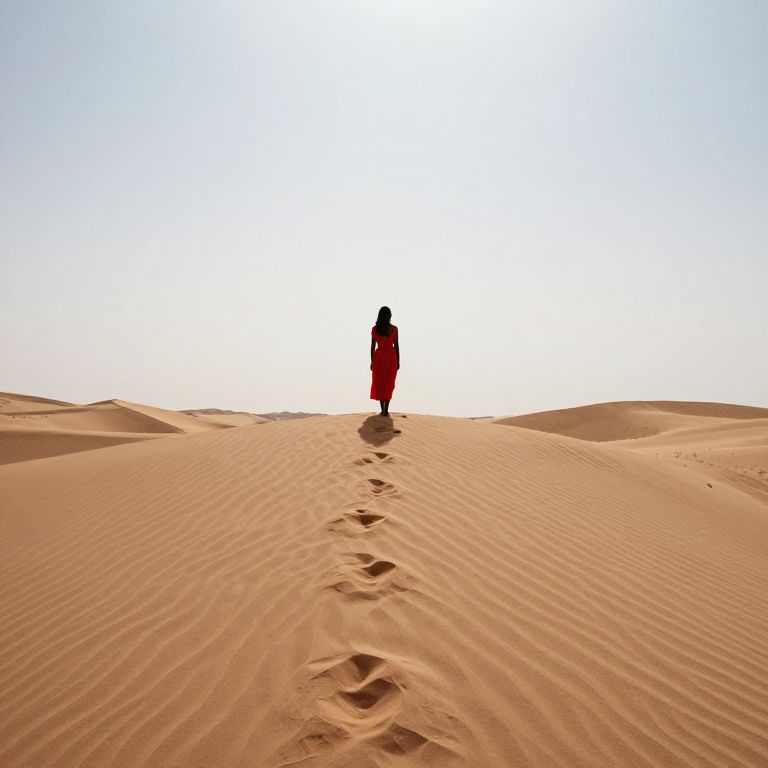 Silhouette of a lone figure in a vibrant red dress stands atop a vast, rippling sand dune under a serene sky, casting a trail of footprints that lead into the endless expanse of the desert horizon.
