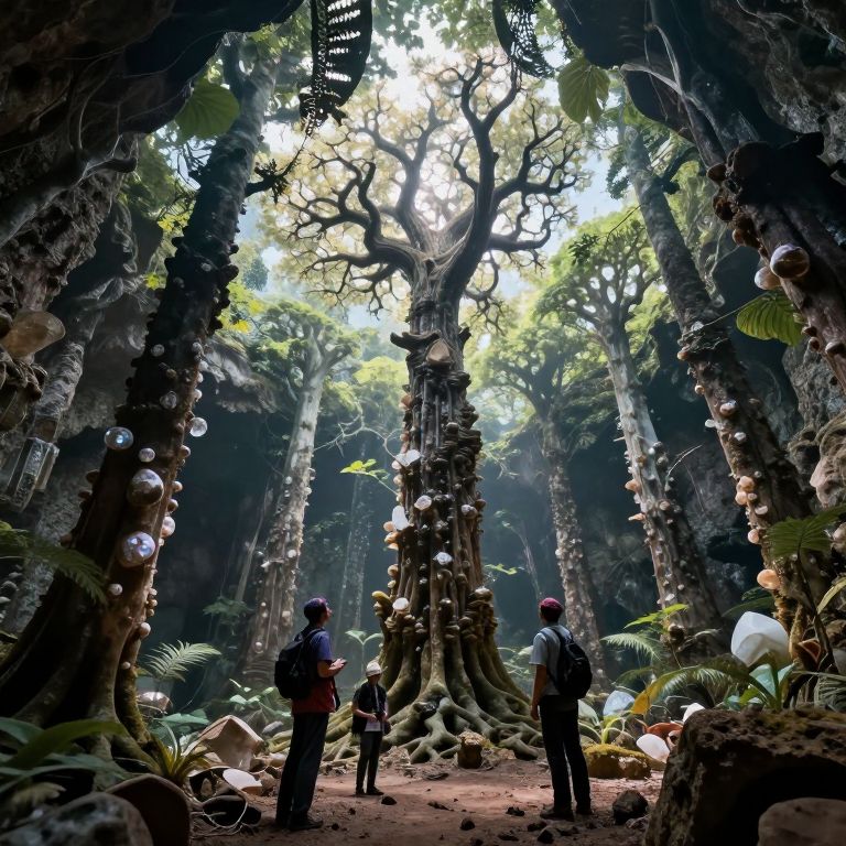 Mineralogists discover a subterranean forest where gemstone trees grow backwards from crystalline skies, leaves sparkling with captured sunlight.