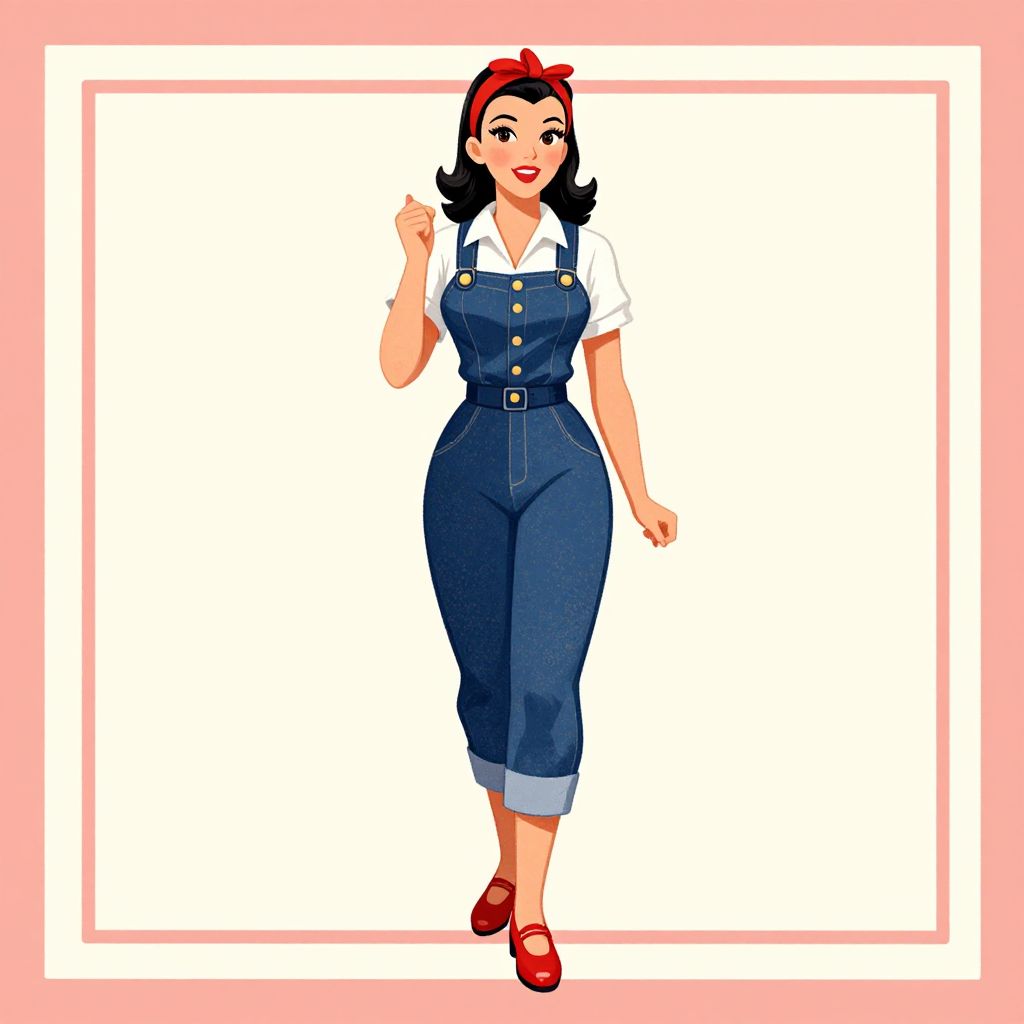 Rosie the Riveter-inspired illustration featuring a woman wearing 1940s-style dungarees and a white blouse, accessorized with a red headband and matching shoes, set against a framed background with a soft pink border.