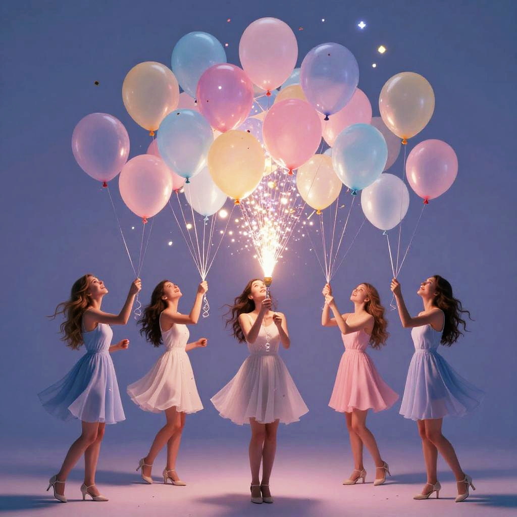 Women popping balloons in surreal dreamscape, oversized balloons bursting with glowing confetti, whimsical expressions, pastel colors, fantasy art style, soft lighting, magical atmosphere