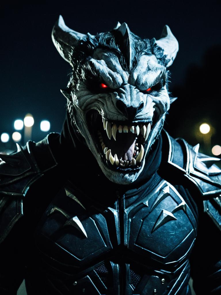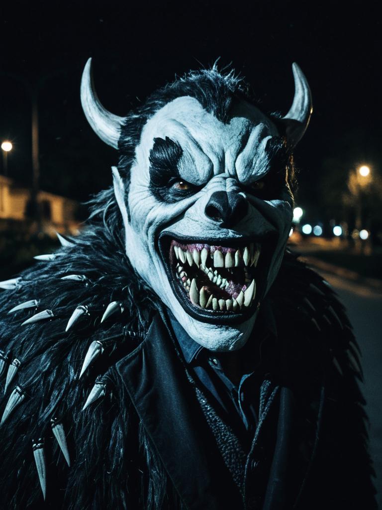 Man in Beast Teeth Costume, photorealistic outdoor night portrait, cinematic realism