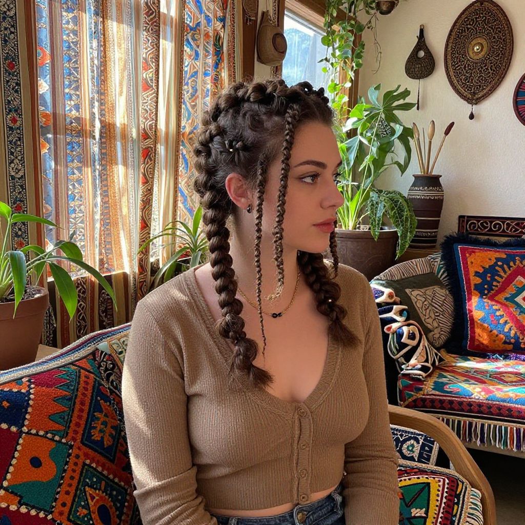 Photograph of a young woman with light skin and dark, tightly coiled braids adorned with black beads. She wears a brown, ribbed, long-sleeve crop top that reveals a hint of cleavage. She sits in a colorful, bohemian-style room with patterned curtains, vibrant cushions, and potted plants. Sunlight streams through a window, illuminating her face and the intricate details of the room. She gazes to the right, her expression calm and contemplative. The room's decor includes geometric patterns and a mix of textiles in rich, warm colors. The overall vibe is eclectic and earthy.