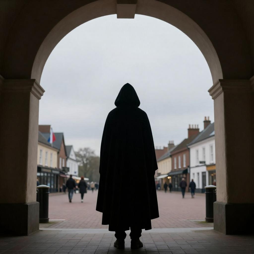 Silhouetted figure in dark hooded cloak walks under archway, facing away. Overcast sky, buildings, and people in background. Loose cloak, boots, misty atmosphere. Buildings have gabled roofs, flags, and signage. Ground is wet and red-brick.