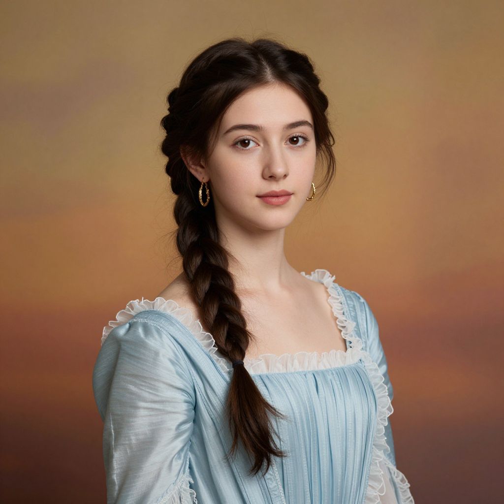 Elegant portrait of a young woman by E. N. Downard, featuring her dark brown hair styled in an intricate braid, adorned with gold hoop earrings, and dressed in a light blue gown with delicate white ruffled trim, set against a warm, gradient background.