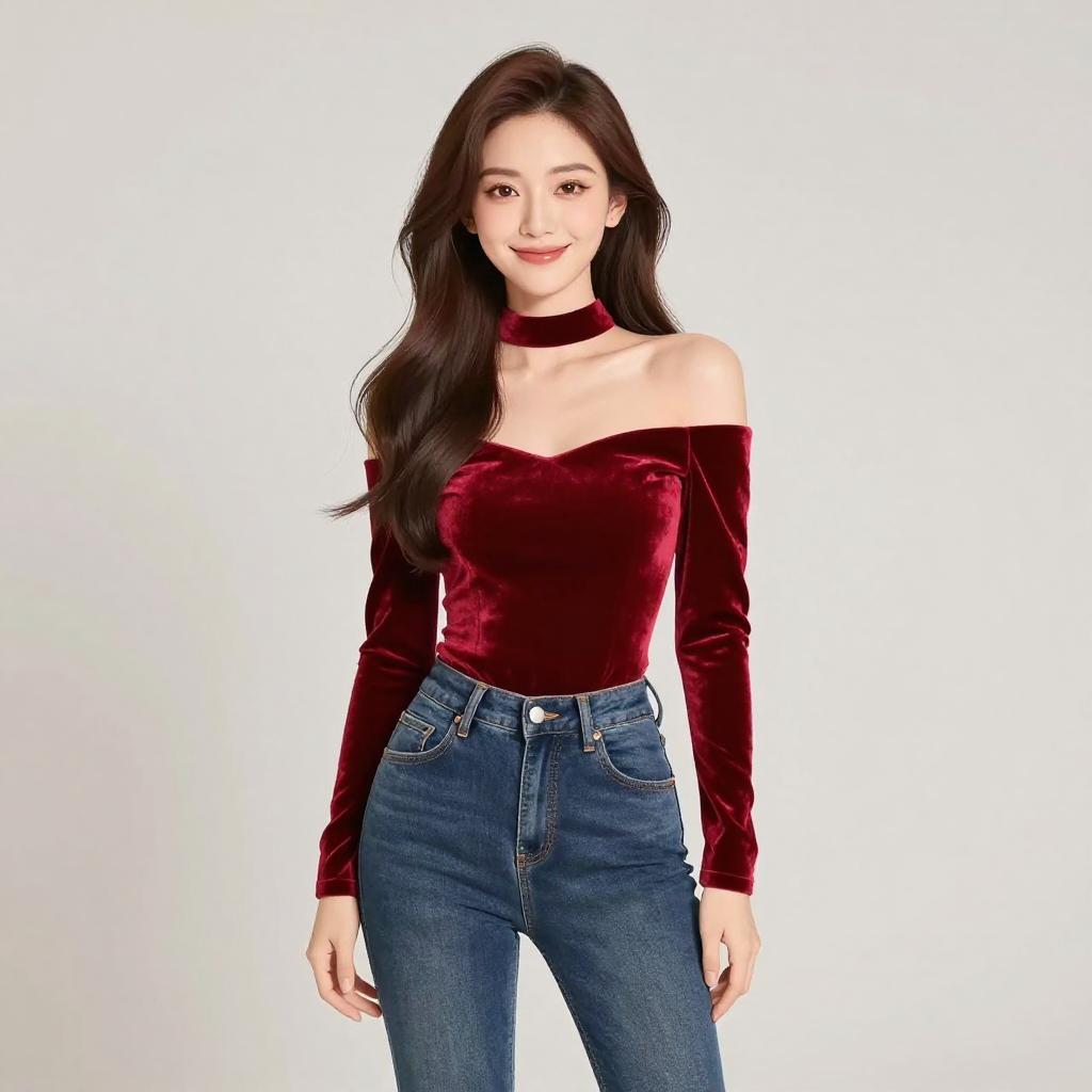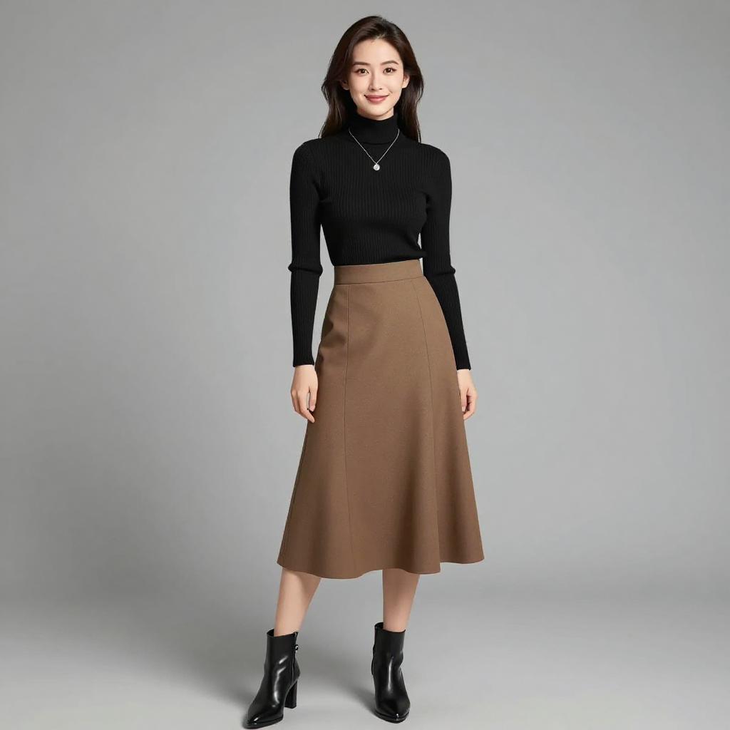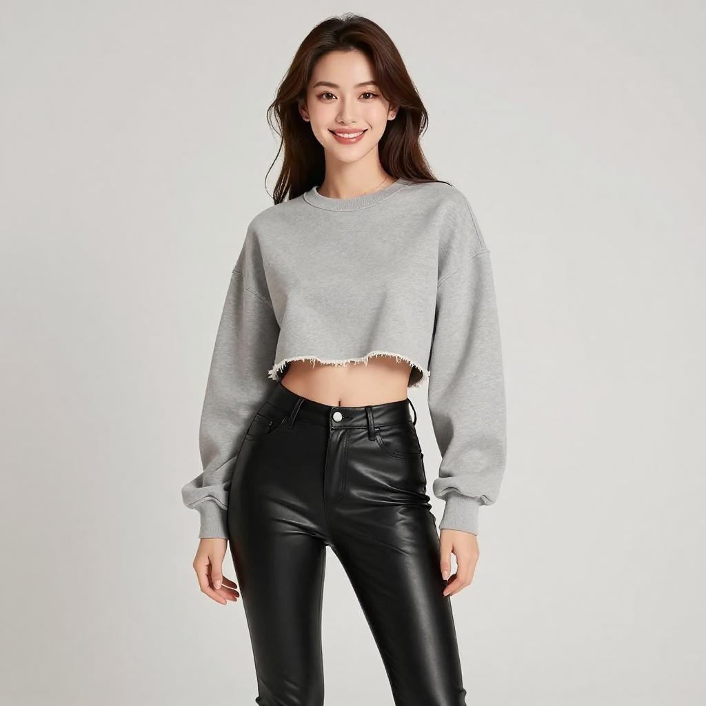 Woman with pretty face and pretty hair. smiling Woman, casual streetwear, cropped light grey sweatshirt, raw hem, long sleeves, dropped shoulder seams, quilted pattern black leather pants, mid-rise, skinny fit, plain studio background. --sref 1467