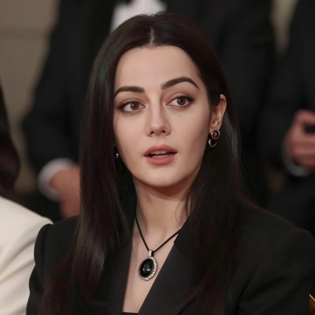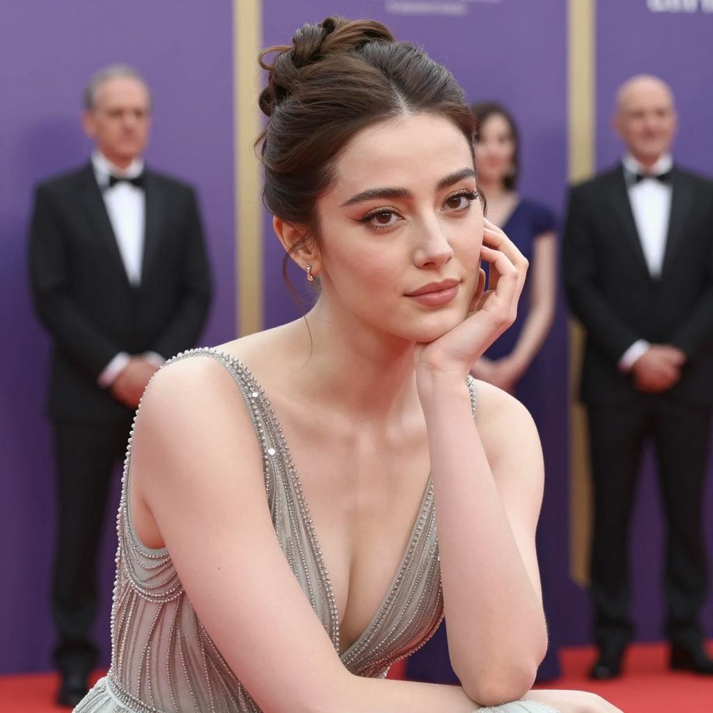 Photograph of a woman with fair skin and brown hair in an elegant updo, wearing a silver, beaded gown, resting her cheek on her hand. She has light makeup and a thoughtful expression. Background: purple wall with gold trim, blurred figures in formal attire. Three people in the background, two men in suits and one woman in a dress, standing.