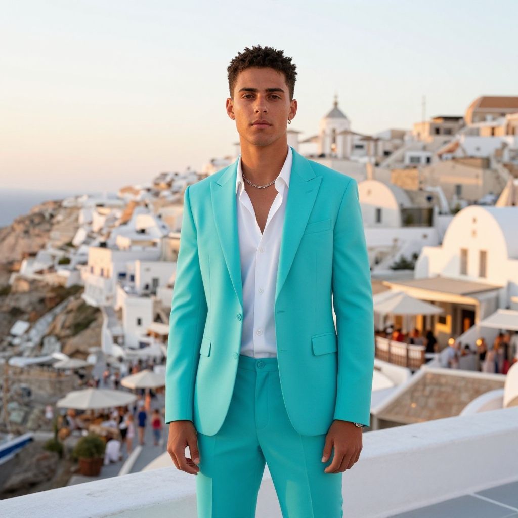 A stylish young man poses confidently in a vibrant turquoise suit against the picturesque backdrop of a traditional coastal village. The scene captures the essence of summer, with warm evening light illuminating the charming white-washed buildings and lively crowd. This image reflects a blend of sophistication and leisure, making it perfect for themes of fashion and travel.