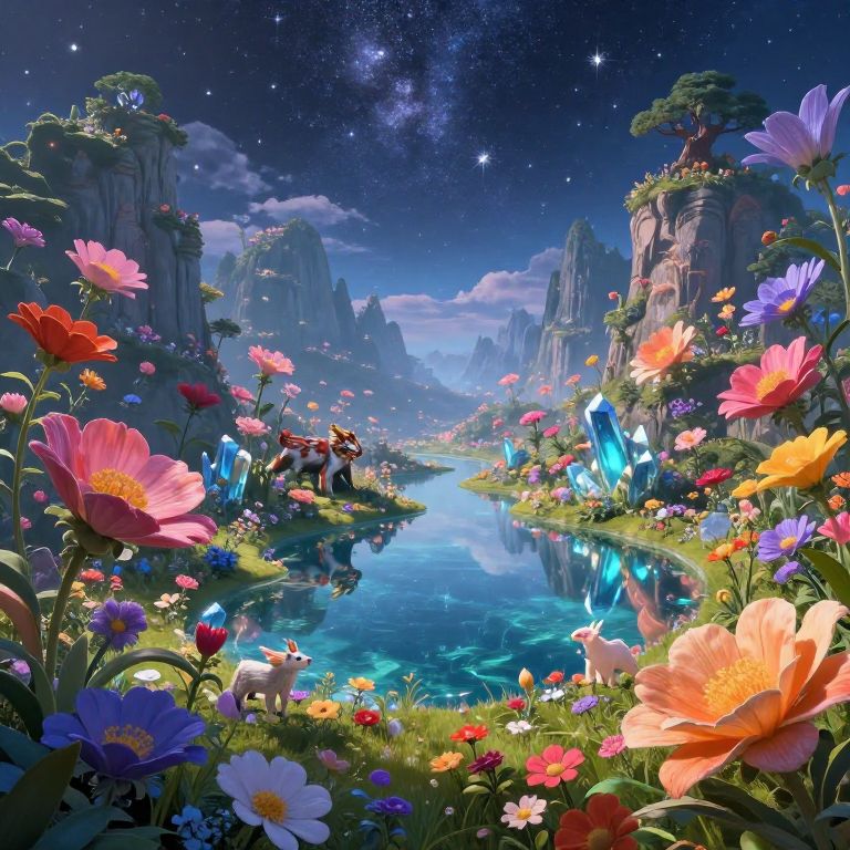 Fantasy landscapes showing an enchanted valley filled with giant colorful flowers, crystal-clear lakes reflecting a starry night sky, mythical beasts roaming peacefully, surreal lighting effects and an aura of magical tranquility, rich in detail.