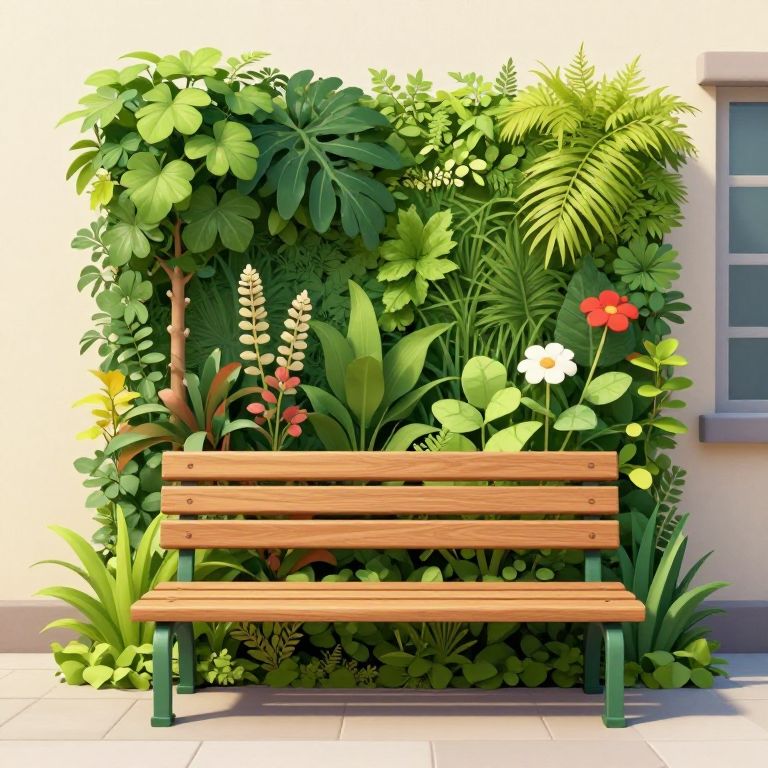 The image depicts a charming, comic-style illustration of a tiny vertical garden with a bench in front. The garden is densely packed with lush greenery, including a variety of leaves and flowers, creating a vibrant and natural backdrop. The bench, made of wooden slats, is positioned in front of the garden, inviting viewers to imagine sitting and enjoying the serene environment. The bench is supported by sturdy, green metal legs that blend seamlessly with the garden's foliage. The overall composition is balanced, with the bench and garden occupying the central space, while the background features a simple, light-colored wall with a window, adding depth to the scene. The interplay of colors, textures, and shapes creates a harmonious and visually appealing image, capturing the essence of a peaceful outdoor retreat.