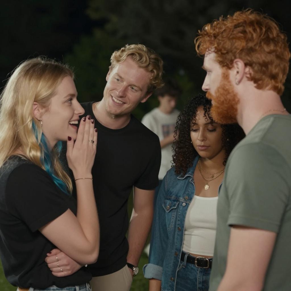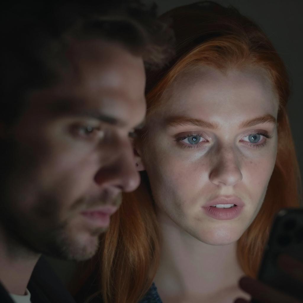 Two people sitting outdoors at night. Woman with long red hair, wearing a blue and white jacket, blue jeans, and beige boots, is intently looking at a smartphone. Man with short brown hair, wearing a brown jacket, blue shirt, and blue jeans, sits beside her. Both are on a grassy area with a dark background. Woman's right knee is up, and she is leaning forward. Man is sitting with legs crossed. Light source from the front highlights their faces and upper bodies.