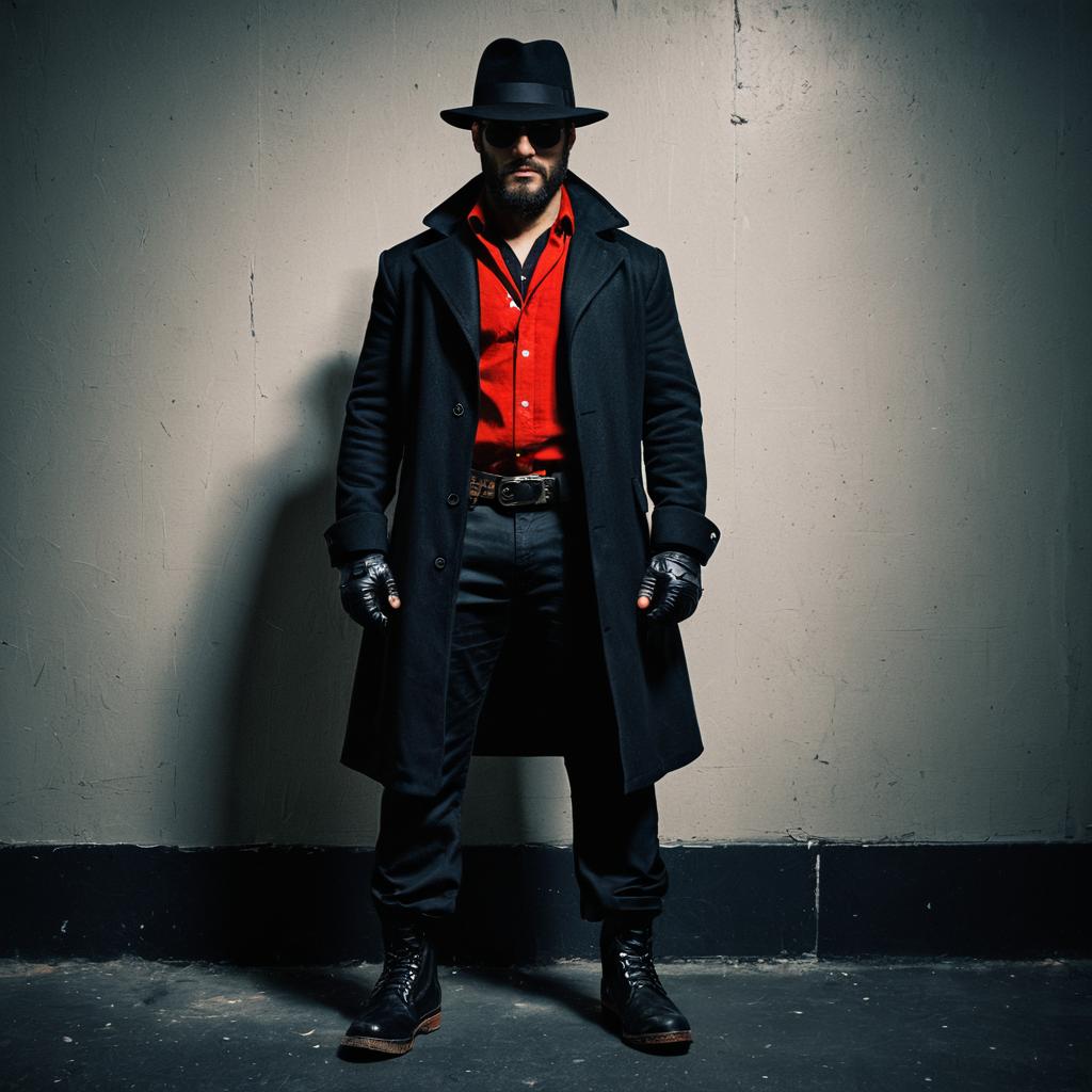 Full-body portrait of a man standing against a plain wall wearing a black fedora, sunglasses, a red collared shirt under a black long coat, black pants, fingerless black gloves, and black boots. The man has a beard and mustache, projecting a tough and confident gangster style.