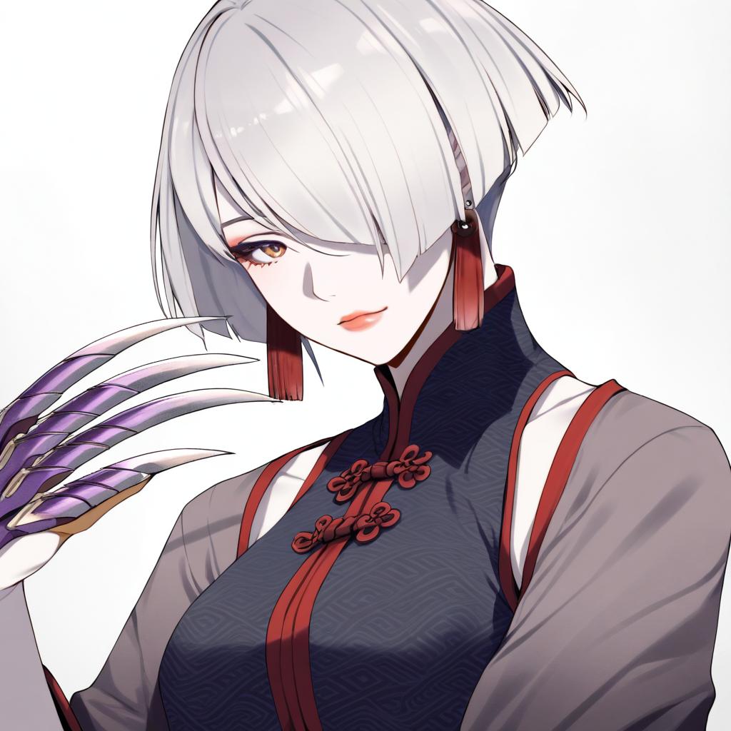 A.k.i. (street fighter), street fighter, 1girl, pale skin, red lips, mole under mouth, red eyes, hair over one eye, short hair, white hair, grey hair, china dress, chinese clothes, tassel earrings, claw (weapon), claw ring, by artist valefal coneri, animagine