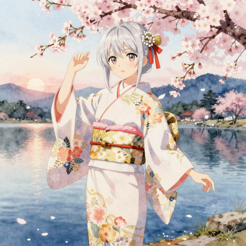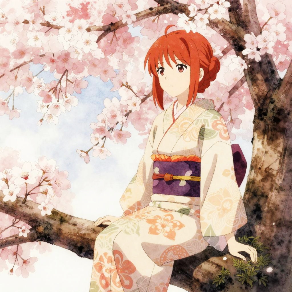 Anime girl with green hair holding a bouquet of wildflowers, dressed in traditional Japanese kimono with nature-inspired patterns, soft sunlight filtering through cherry blossoms in the background, delicate brushstroke style anime art