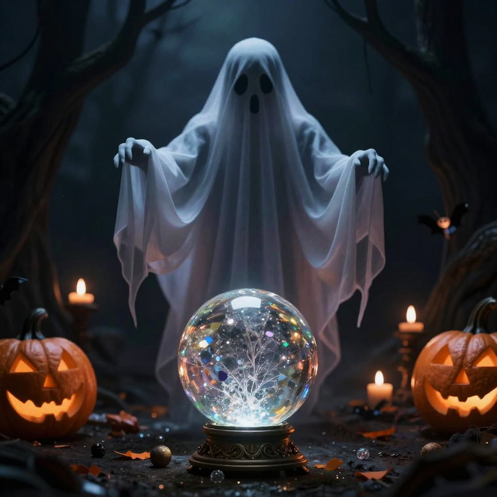 Realistic photo.Halloween setting with a sinister ghostly figure floating and a shimmering crystal ball. The scene is eerie with dark, festive charm. realistic photo