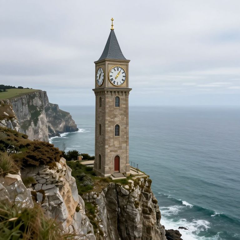 A whimsical clocktower perched precariously on the edge of a cliff, defying gravity as it stands sideways, its golden hands frozen in time amidst a breathtaking coastal landscape.