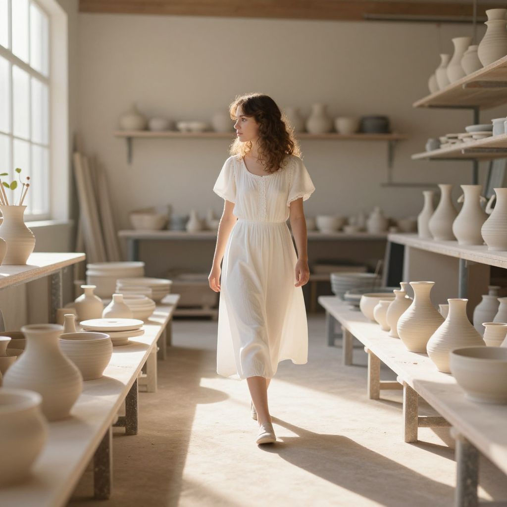 Photograph of a woman with curly brown hair, standing in a sunlit pottery studio. She wears a white, short-sleeved, knee-length dress and white shoes. The studio is filled with rows of wooden benches displaying various white ceramic vases and bowls. Sunlight streams through a large window on the left, casting light and shadows across the room. Shelves with more pottery are visible in the background. The overall atmosphere is serene and artisanal, with a focus on natural light and simplicity. The woman is positioned slightly to the right, looking to the left.