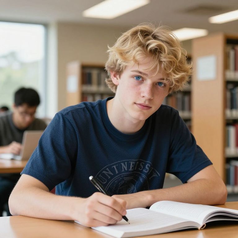 A college student with messy blonde hair and bright blue eyes is studying at a university library table, wearing a navy mesh t-shirt with a faint university logo, warm interior lighting, books and shelves in the background, natural daylight coming through the window, realistic candid shot.
