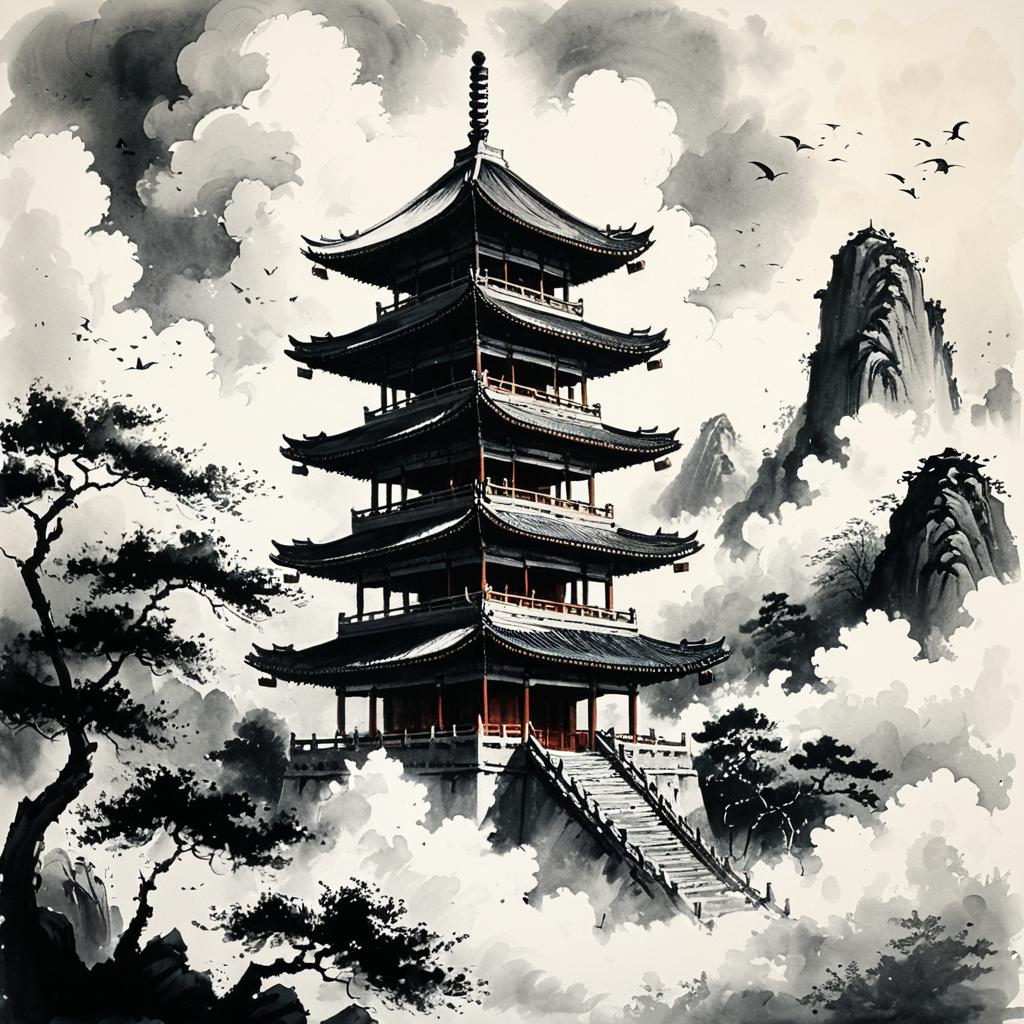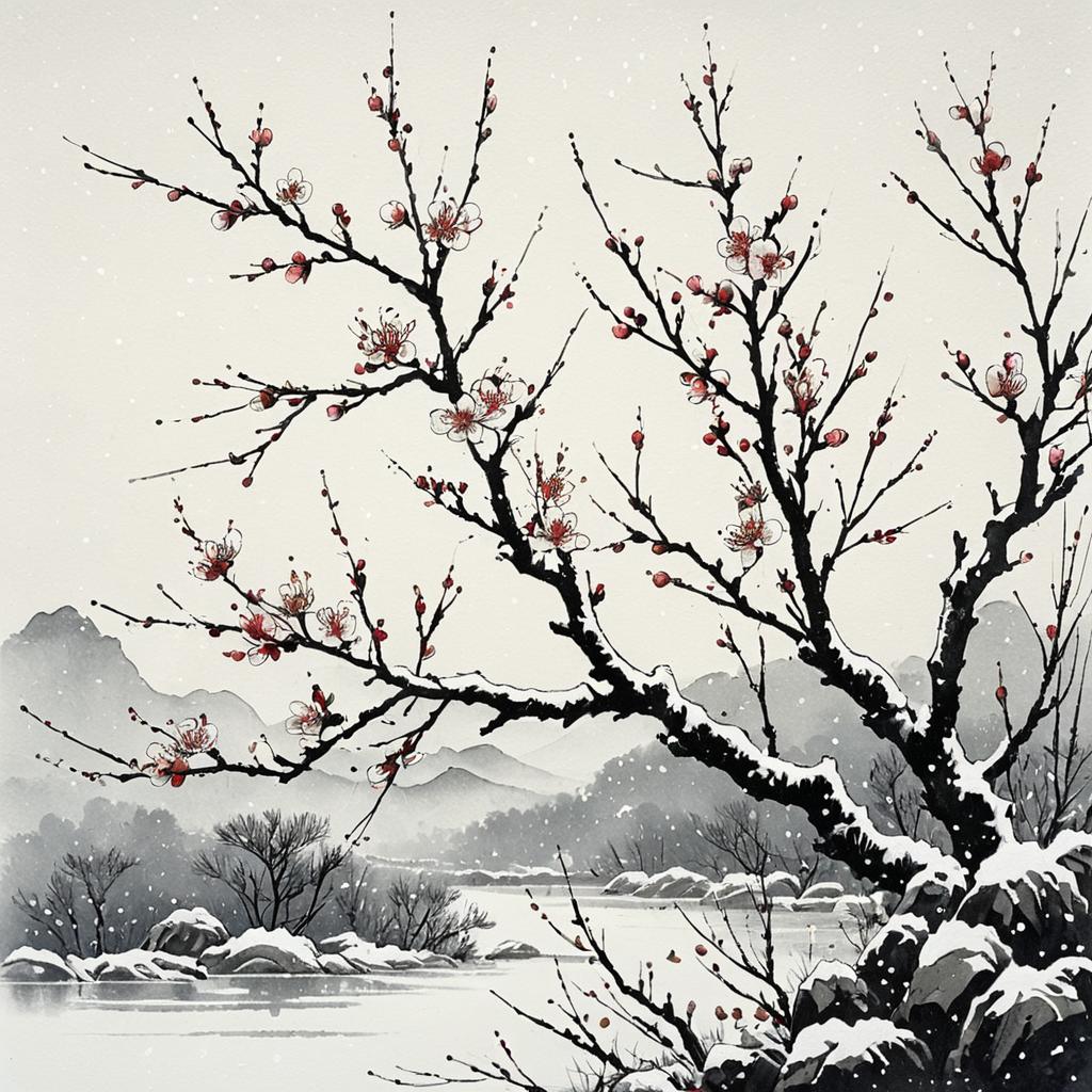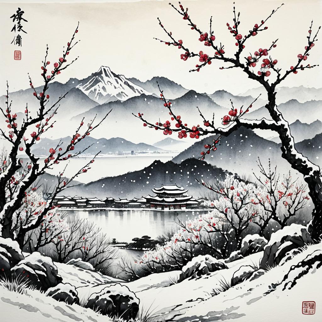 Chinese brush painting of snow-covered plum blossoms with distant mountains in the background, with a pure and serene, brush and ink techniques, traditional style