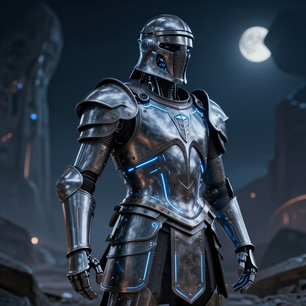 Photorealistic CGI of a shiny, blue-accented medieval knight in silver armor standing under a moonlit night sky with futuristic ruins.