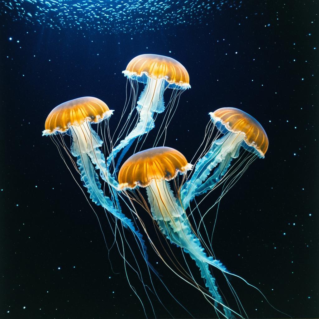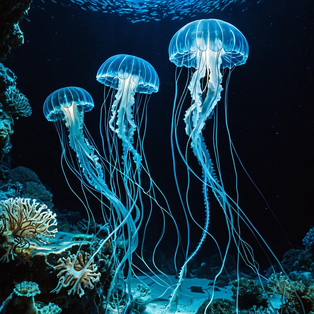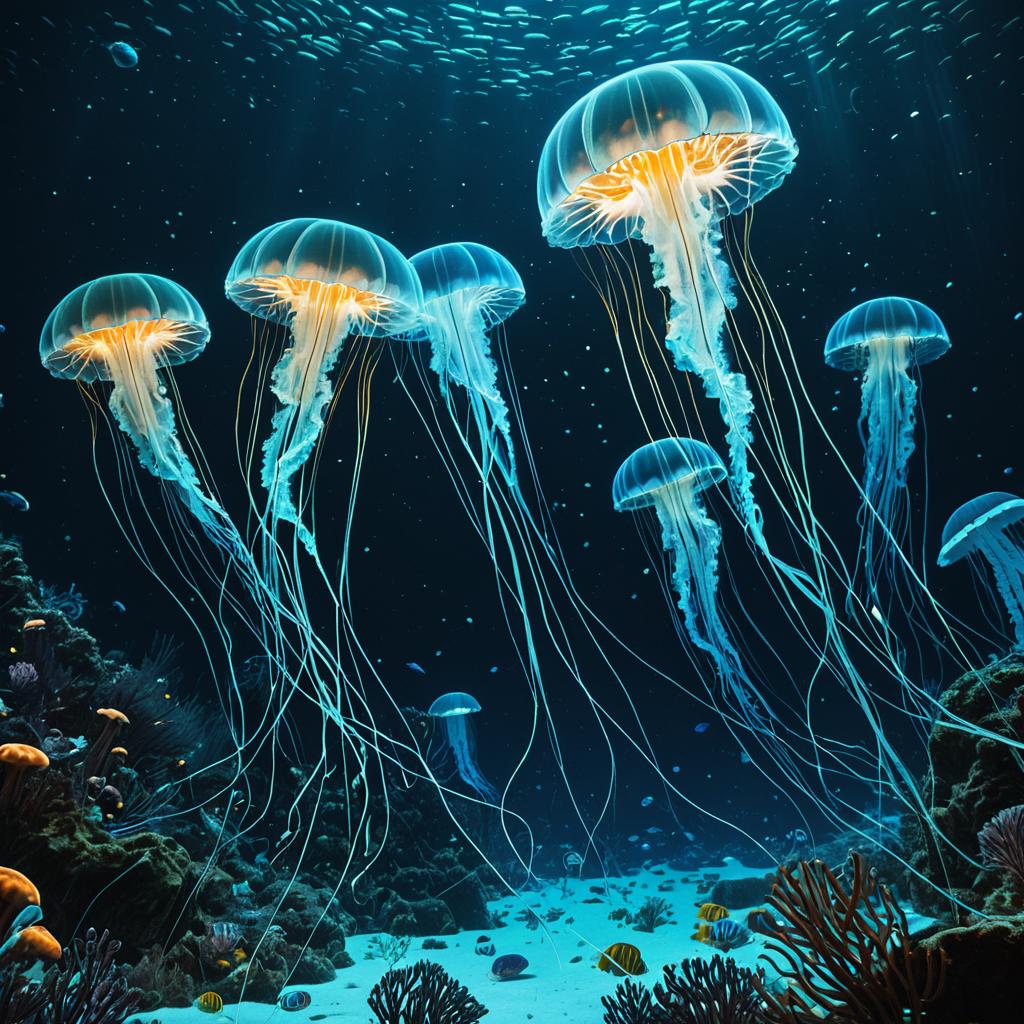 Crystalline sharp photograph of a bioluminescent jellyfish cluster, showcasing the view from beneath the moonpool.