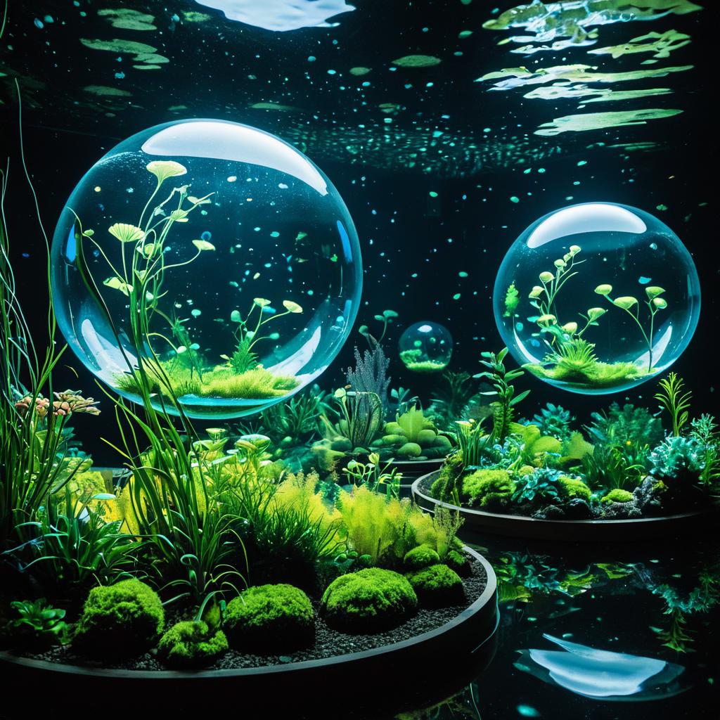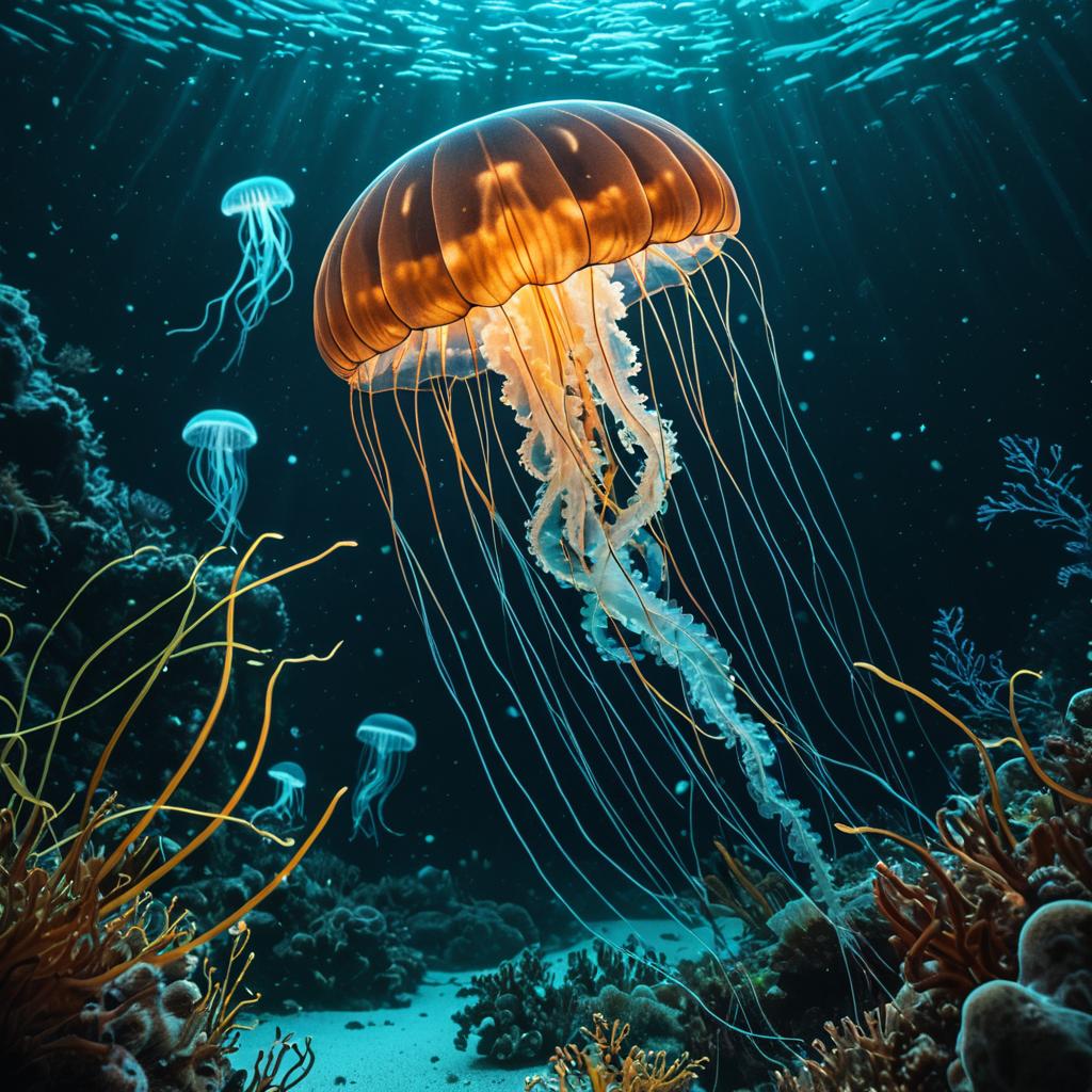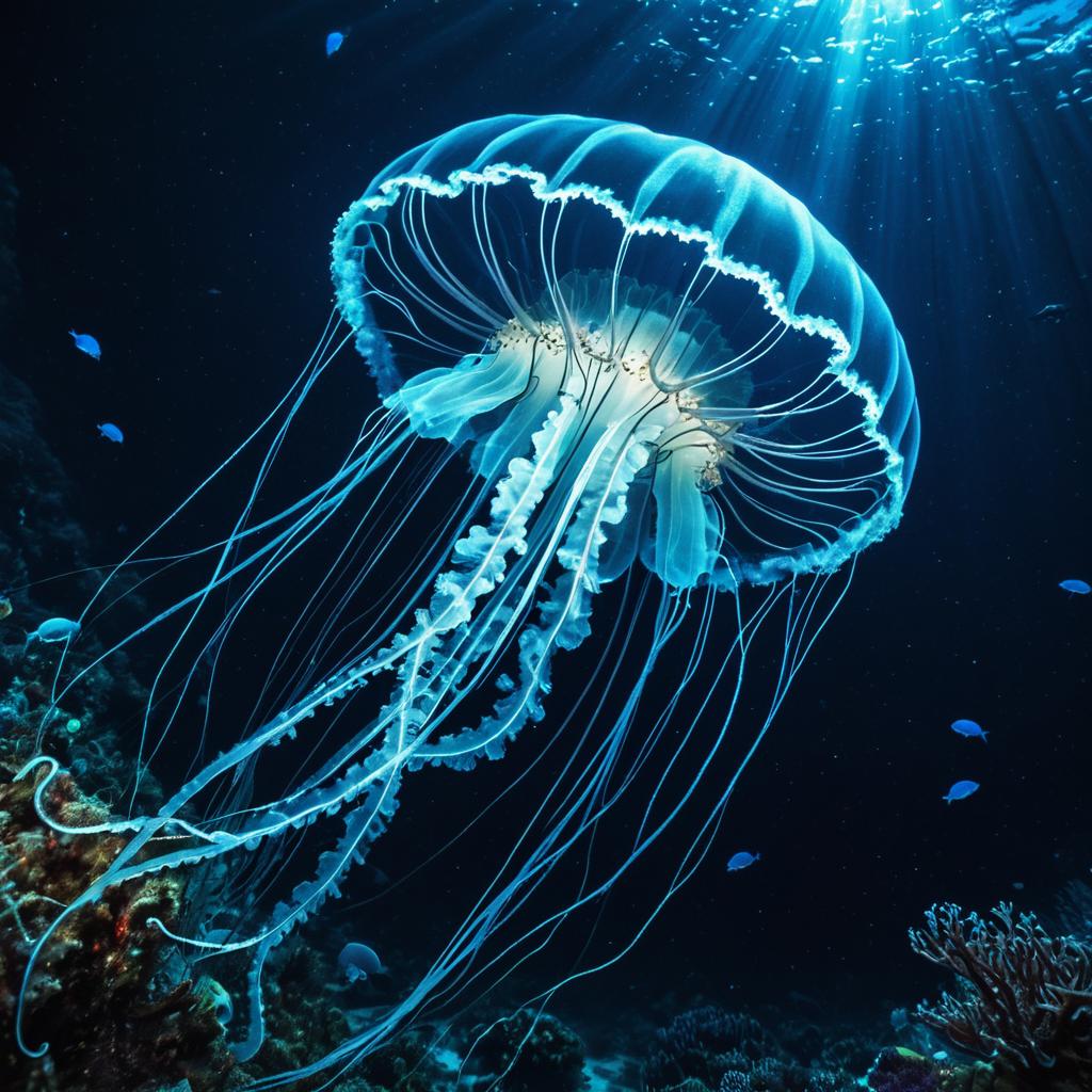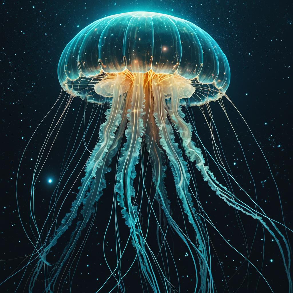 Crystalline sharp photograph of a bioluminescent jellyfish cluster, showcasing the view from beneath the moonpool.