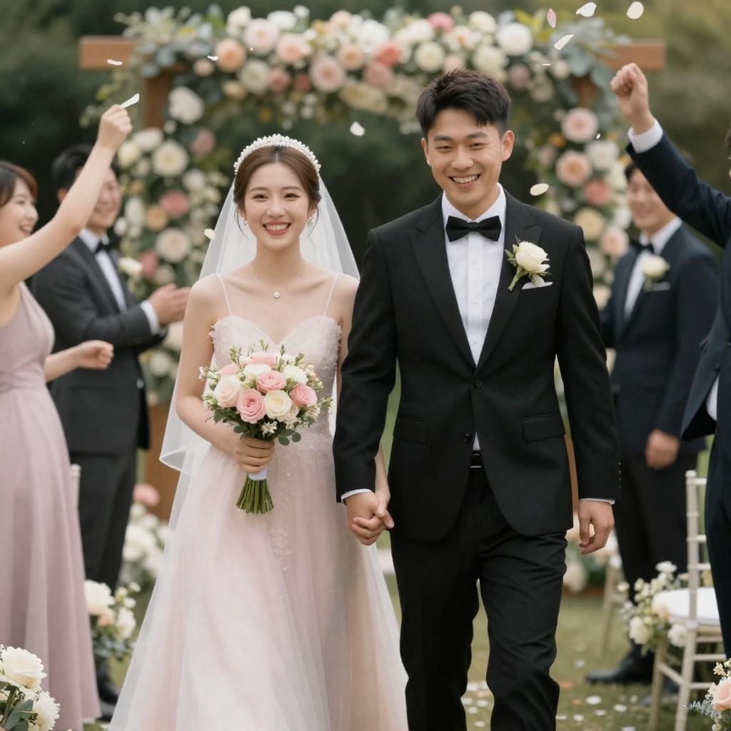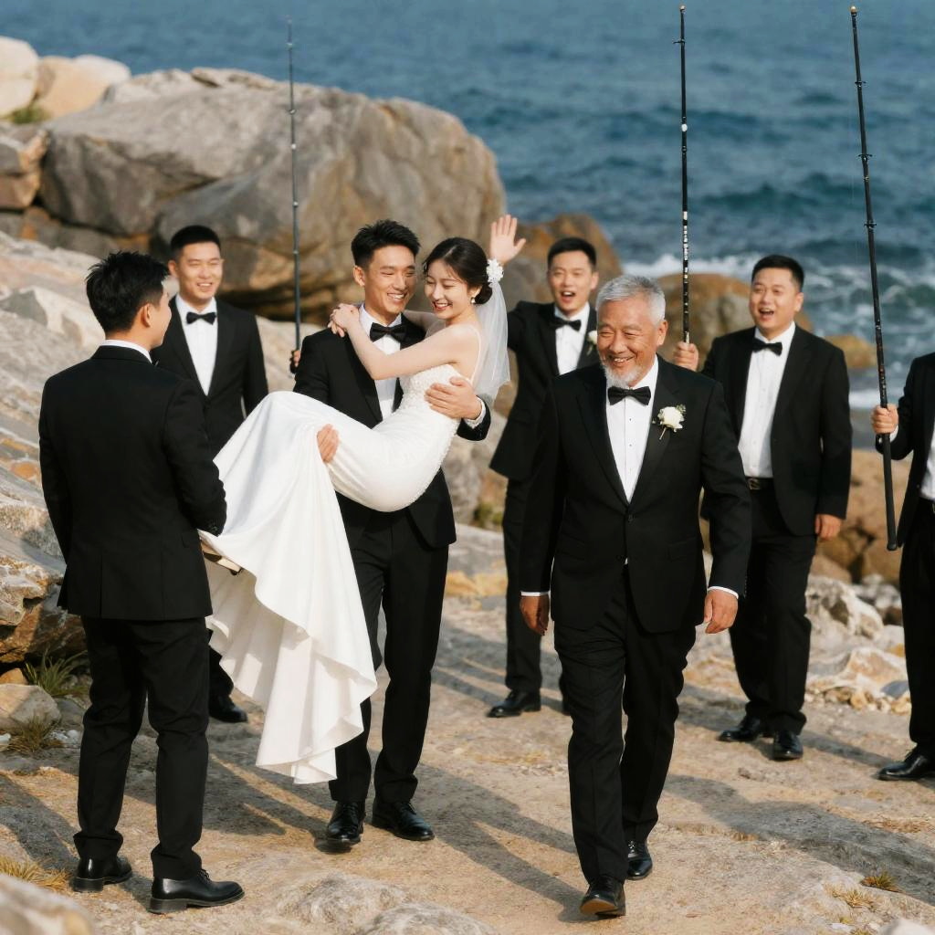A joyful bride in a white lace wedding dress and veil holds a pink bouquet and leans towards an elderly man in a wheelchair wearing a black tuxedo with a white scarf. In the background, a diverse group of smiling and clapping guests dressed in colorful attire celebrates the moment in a bright indoor wedding venue.