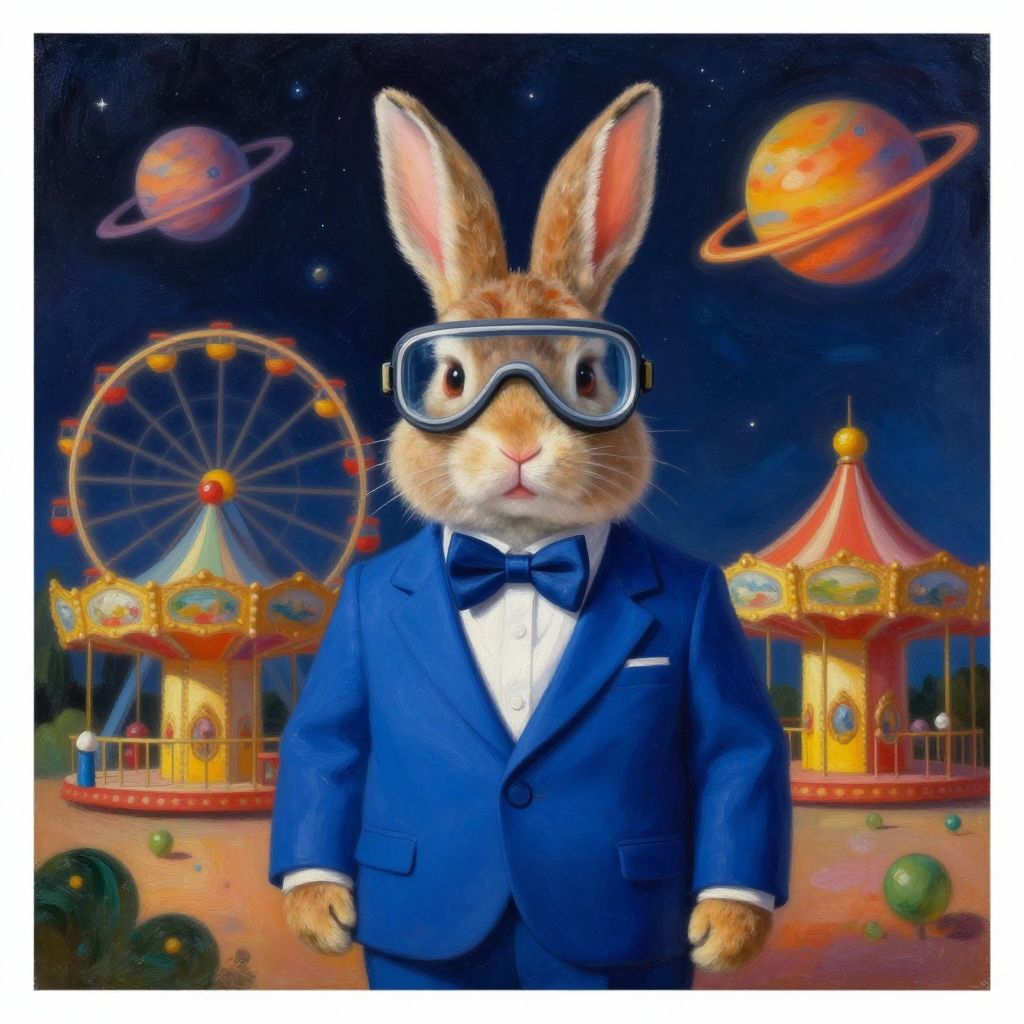 Surreal oil painting of a humanoid rabbit dressed in a blue suit and bow tie, wearing futuristic goggles. The rabbit is portrayed in a cosmic amusement park setting with a Ferris wheel, carousel, and colorful space-like planets floating in the night sky. The scene combines whimsical and vibrant colors with a humorous tone, inspired by artists James Jean and Fernando Botero.