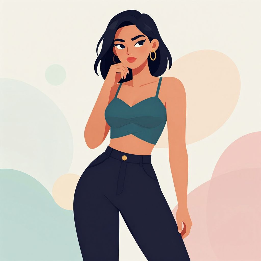 Digital illustration of a confident woman with long black hair, wearing a blue jacket, black crop top, high-waisted shorts, yellow necklace, and