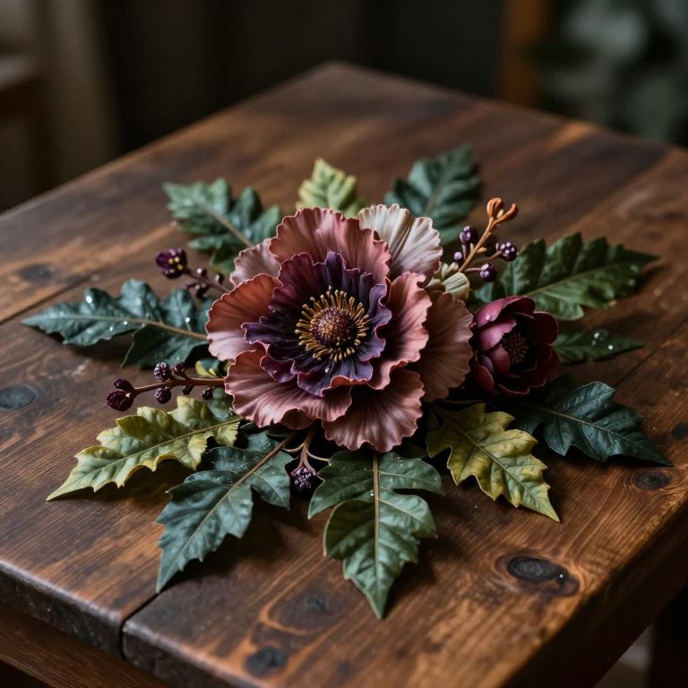 A hyperrealistic, intricately detailed still life of mystical flowers and leaves on an old wooden table, with volumetric lighting, shadows, and textures, creating a high-quality, 4k image.