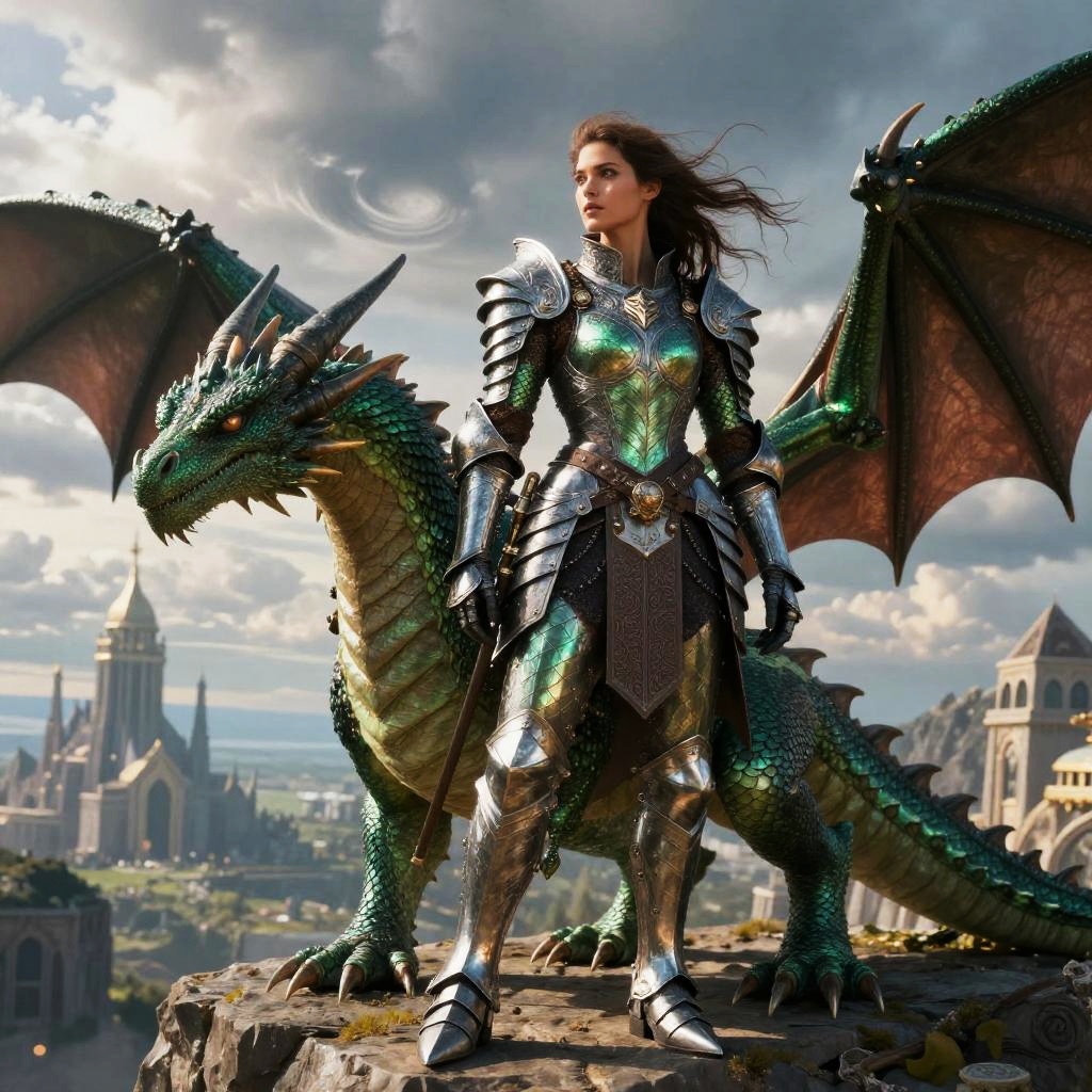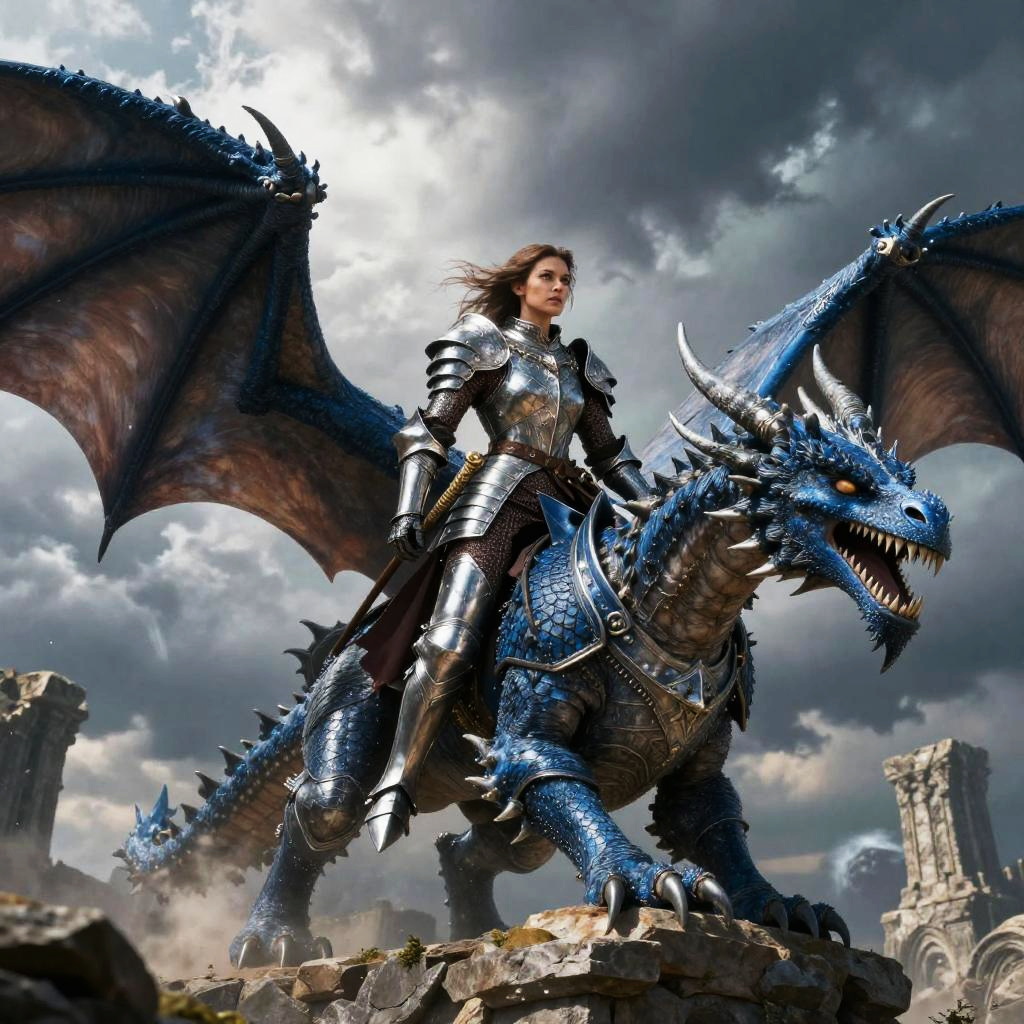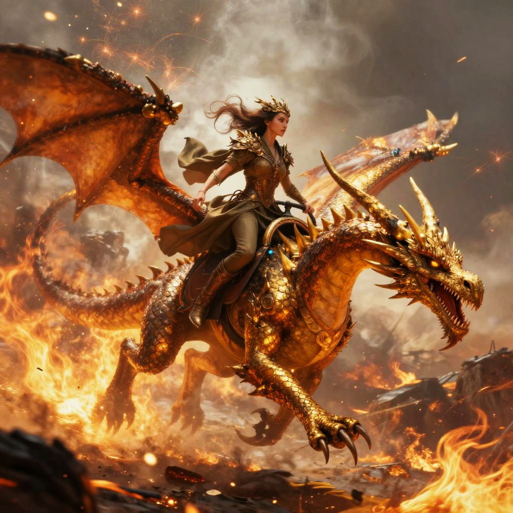 Female dragon rider in a flowing cloak riding a golden dragon over a burning battlefield, fire and smoke blending with magical energy sparks, intense and heroic mood, fantasy digital painting, realistic textures on dragon scales, sweeping dynamic action scene.