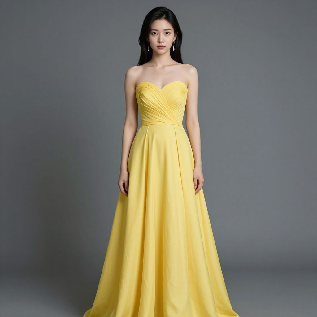 Photograph of an East Asian woman with long black hair standing against a plain gray background. She wears a strapless, bright yellow evening gown with a sweetheart neckline and a gathered bodice. The gown has a flowing, floor-length skirt that accentuates her slim figure. She has a neutral expression, with minimal makeup highlighting her natural features. Her arms hang naturally by her sides. The lighting is even, emphasizing the vibrant color of the dress and her smooth, fair skin. The overall style is elegant and simple, focusing on the dress and the subject's serene presence.