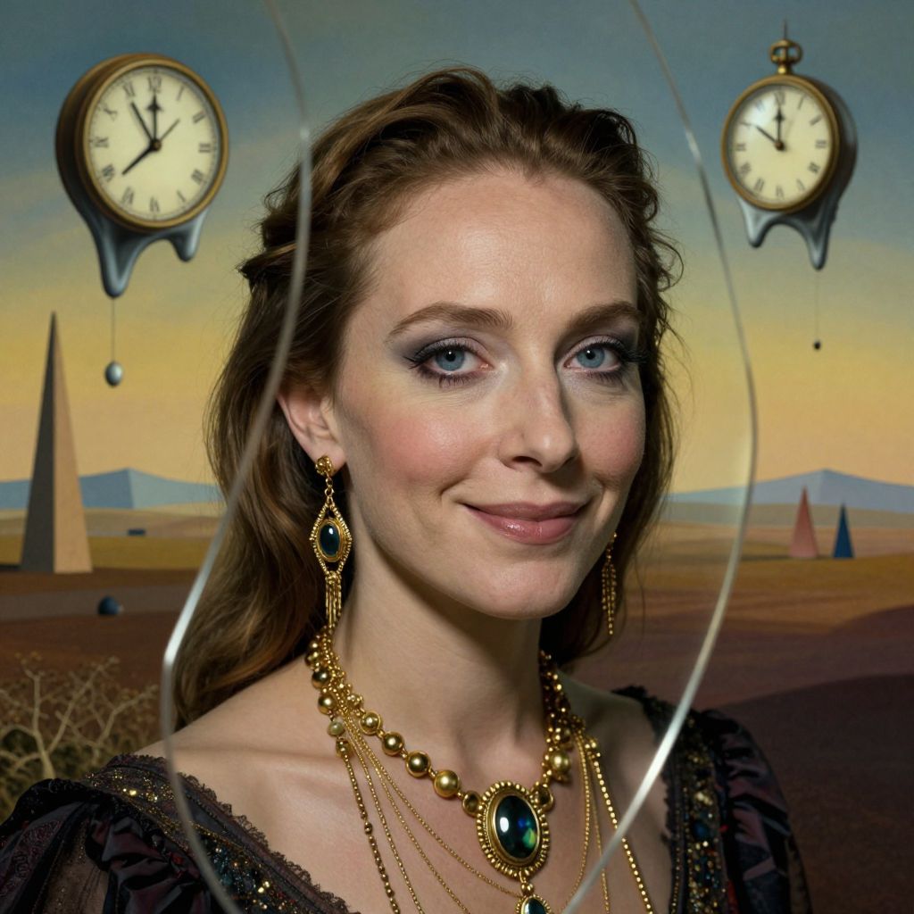 Digital artwork of a smiling fair-skinned woman with blue eyes, wearing gold jewelry and black lace, against a surreal desert backdrop with floating clocks.