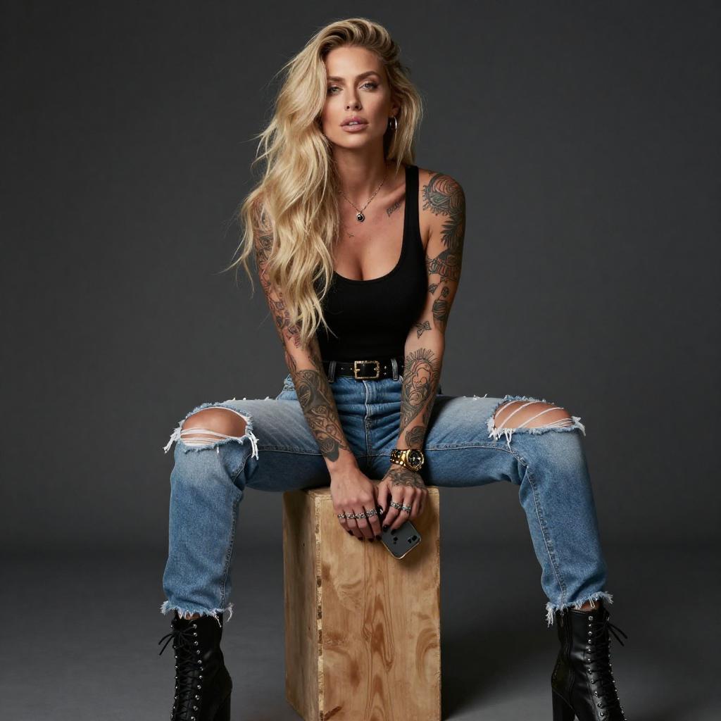 Photograph of a blonde woman with long hair, heavily tattooed arms, and ripped blue jeans, sitting on a wooden block. She wears a black tank top, black studded boots, and holds a smartphone, taking a mirror selfie. The dark background contrasts with her brightly lit figure.