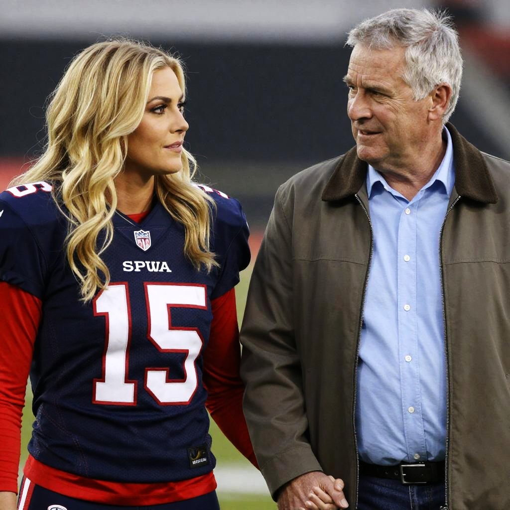 Photograph of a blonde woman with wavy hair in a navy and red football jersey with number 15, standing beside a gray-haired man in a brown jacket and blue shirt. Both are indoors, man holding her hand. Woman looks to the side, man looks at her. Background is blurred. Woman has red sleeves, man has a ring.