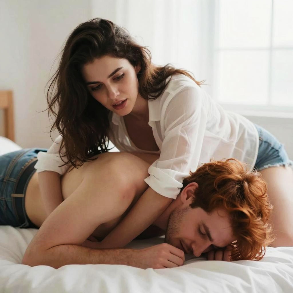 A young man and woman share a passionate moment on a white bed with bright natural light in the background. The woman with long dark brown hair wears a white semi-transparent blouse and denim shorts, positioned closely over a shirtless man with red hair and denim jeans. The scene captures intimacy and intensity in a cozy, softly lit bedroom setting.