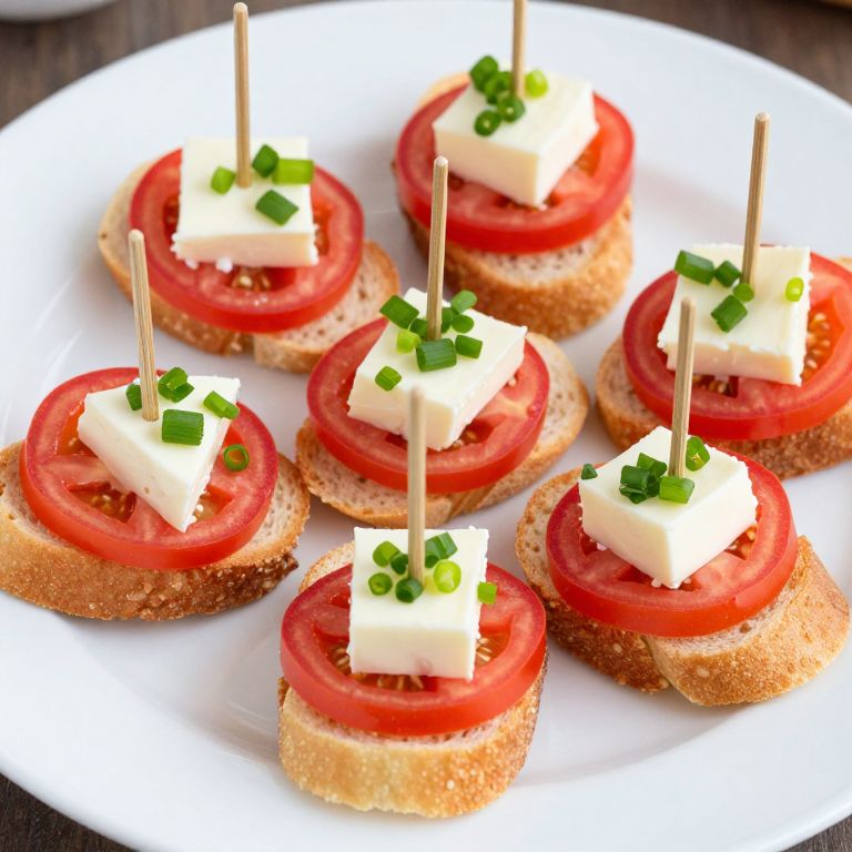 Arranged neatly on a pristine white plate, vibrant appetizers feature golden-brown bread slices topped with fresh tomato slices, cubes of creamy cheese, and a sprinkling of finely chopped green onions, all secured with wooden skewers for easy serving.