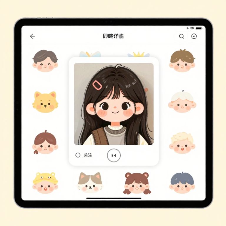 This is a digital illustration depicting a user interface on a tablet screen. At the center is a cute, anime-style girl with long black hair, a pink hairclip, and large brown eyes. She wears a white top with a brown strap. Surrounding her are small, chibi-style headshots of various characters, including a yellow fox, different hair colors, and a blue-haired girl. The background is white with a black border around the tablet screen. Japanese text is at the top center, and a circular button is at the bottom center. The overall style is kawaii and colorful.