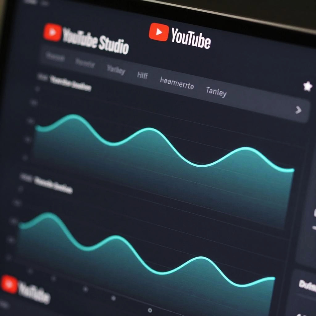 YouTube Studio dashboard, detailed close-up of analytics and revenue charts, dark mode, professional design with smooth gradients, futuristic UI elements with glowing graphs, digital creator hub concept