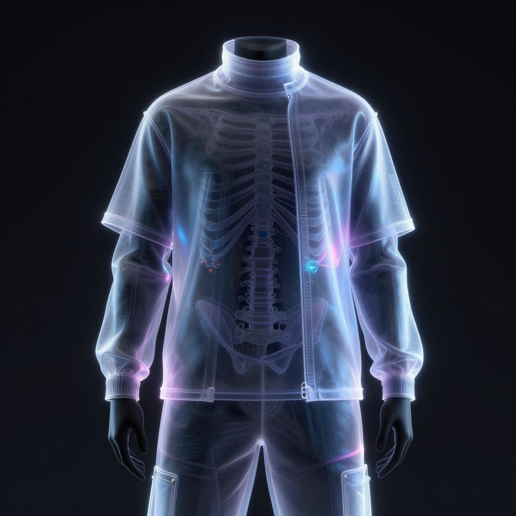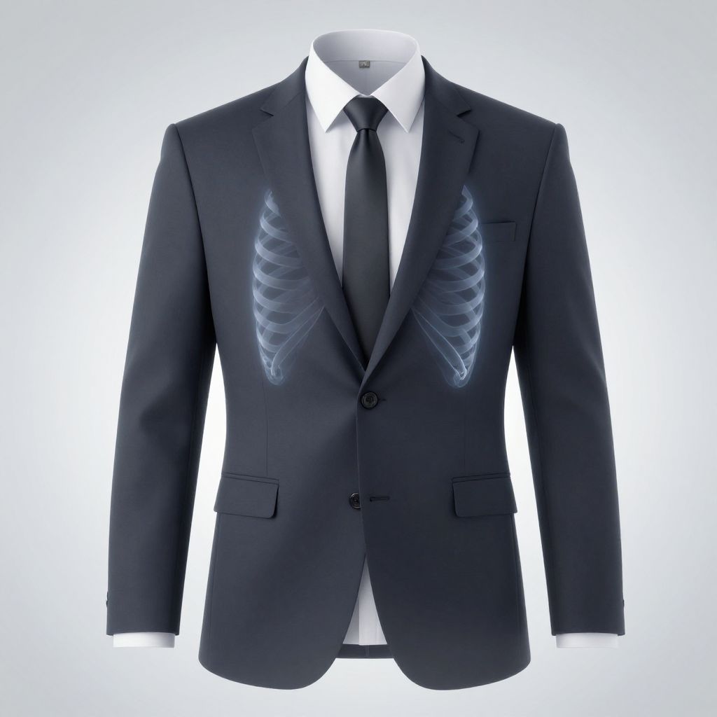 Xray clothes Photoshop style showing formal attire with transparent effect, highlighting internal anatomy like ribs and spine, minimalist background with soft gradients, delicate light effects emphasizing depth, sleek and elegant presentation with a modern digital painting approach.