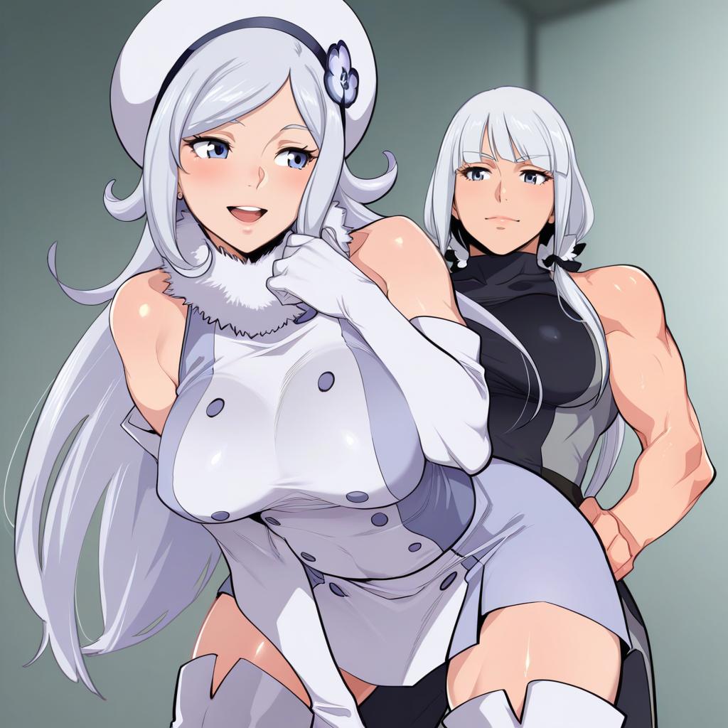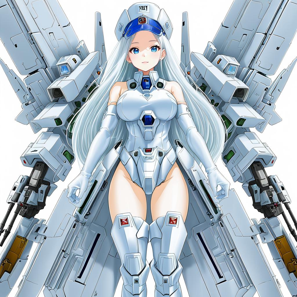 Aila jyrkiainen, gundam, 1girl, blue eyes, long hair, grey hair, white hair, medium breasts, large breasts, thigh boots, elbow gloves, hat, bare shoulders, by artist mikoyan, leet